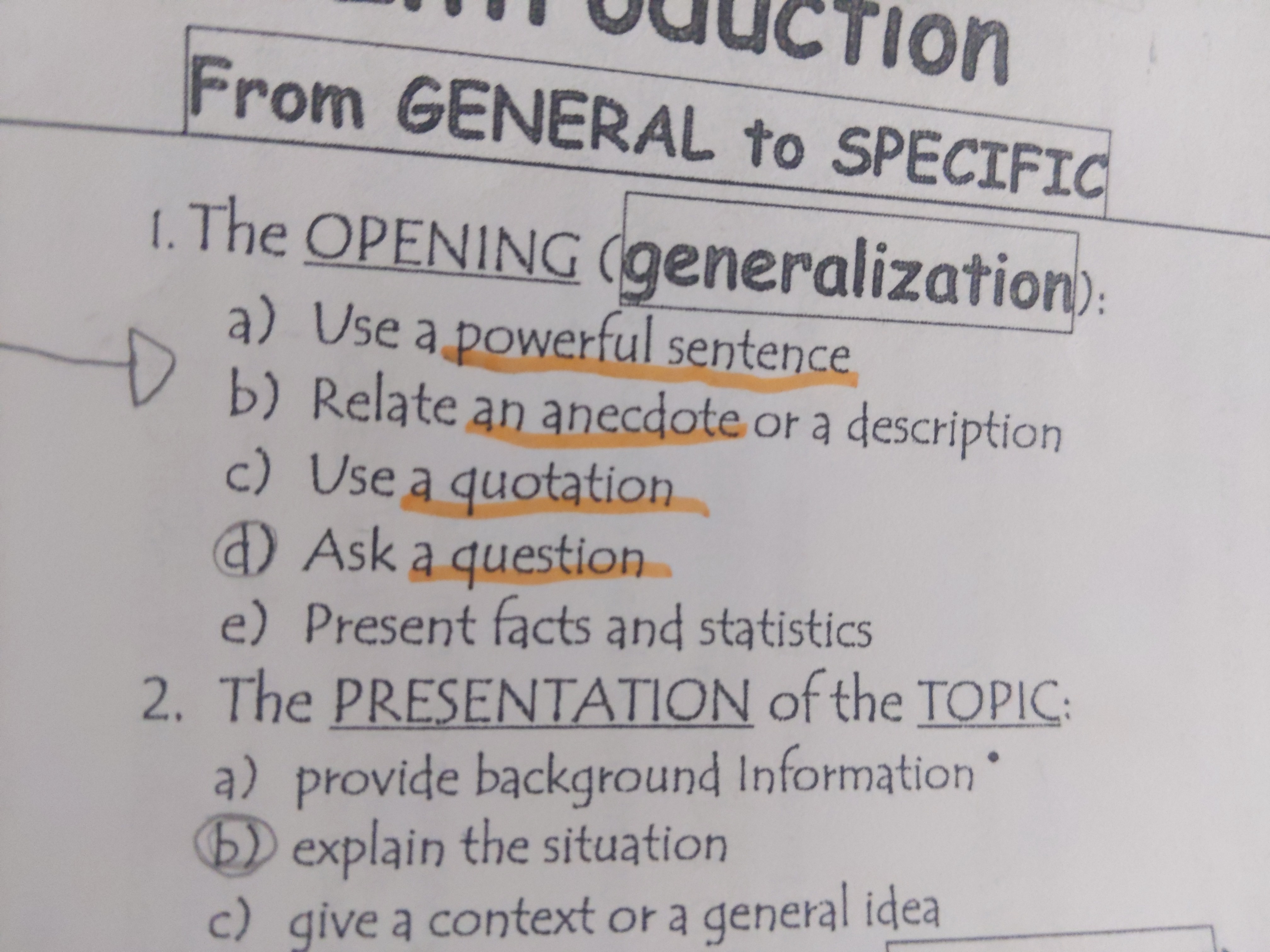 Secondaire 3 • 1aBonjour je fais un texte en anglais et je veux que vous me donnez des exemples comme pour le a) B)c)de) dans le opening generalization? Donner moi des exemples ça va me donner des idées merci