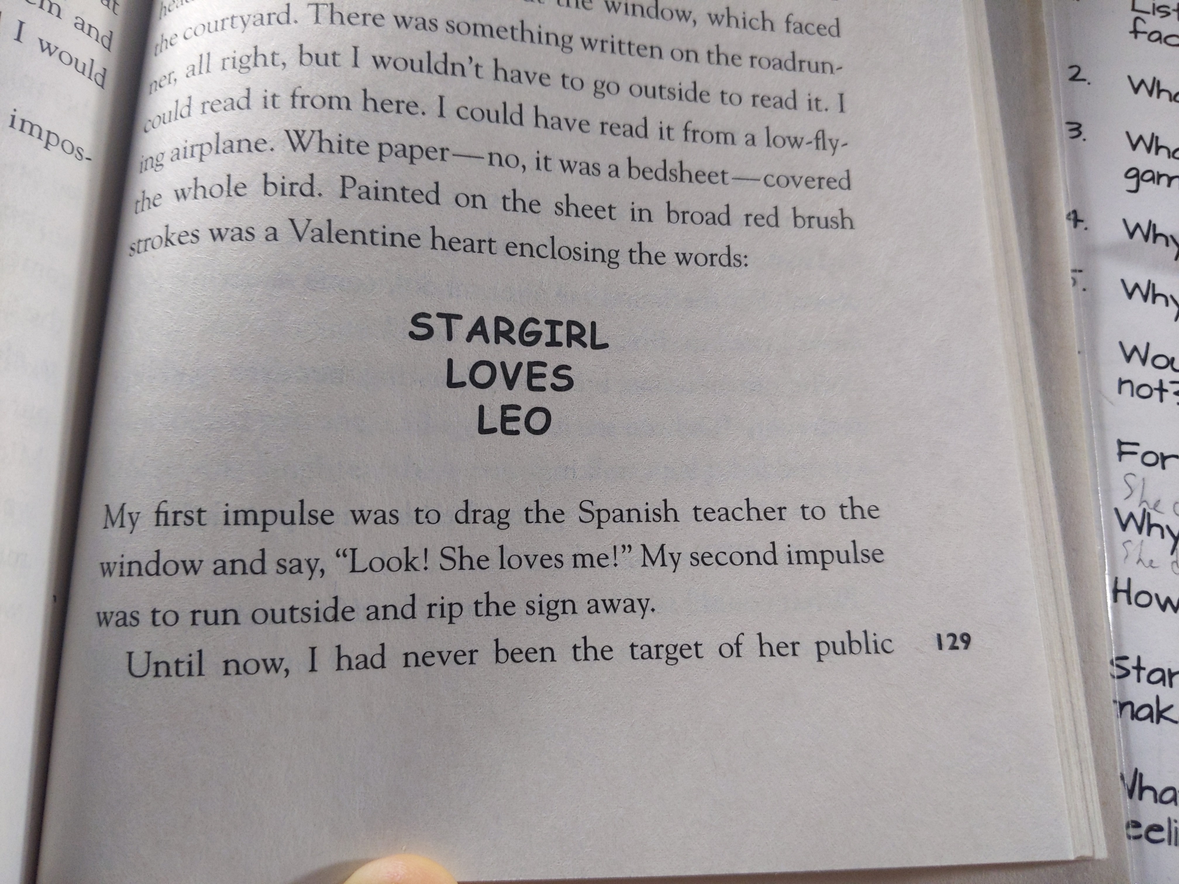 Secondaire 3 • 1aMarilee le livre que je fais référence est stargirl. C'est pour la question précédente.
