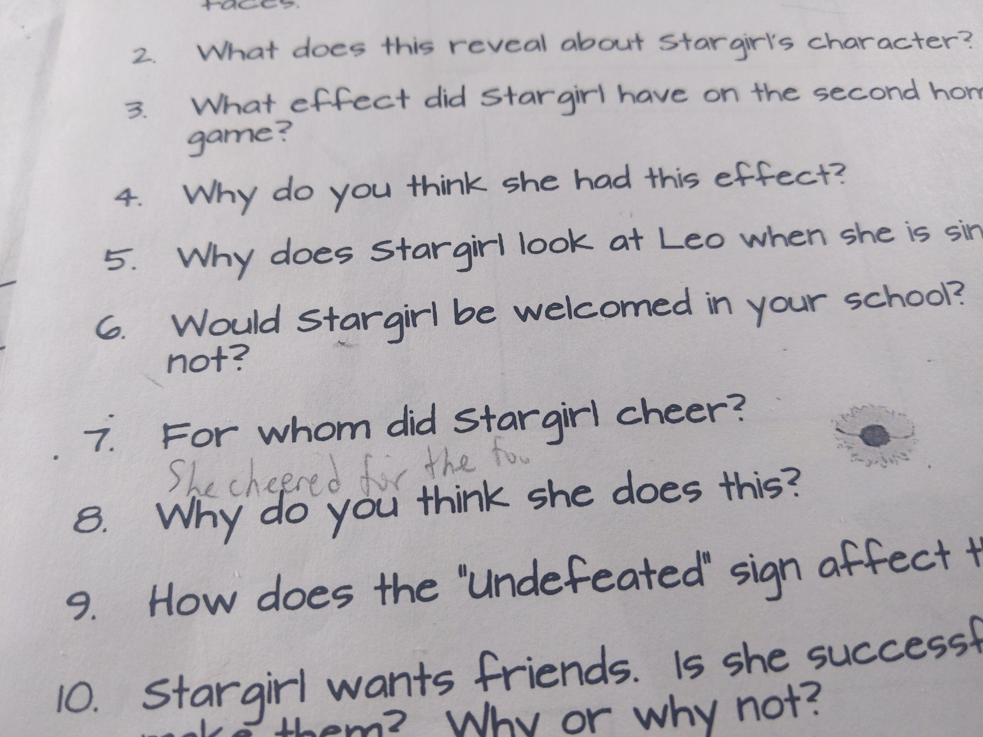 Secondaire 3 • 1a1La question : For whom did stargirl cheer ? Ma question est-ce que le whom c'est quelque ou plusieurs personnes comme équipe ?