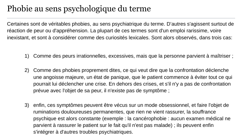 J'ai une question, je fais un projet personnel sur les phobies et pendant ma recherche, j'ai trouvé cette définition:Et je n'ai pas vraiment compris le n°2 et 3. Pouvez-vous me l'expliquer en quelques mots plus compréhensibles, svp?