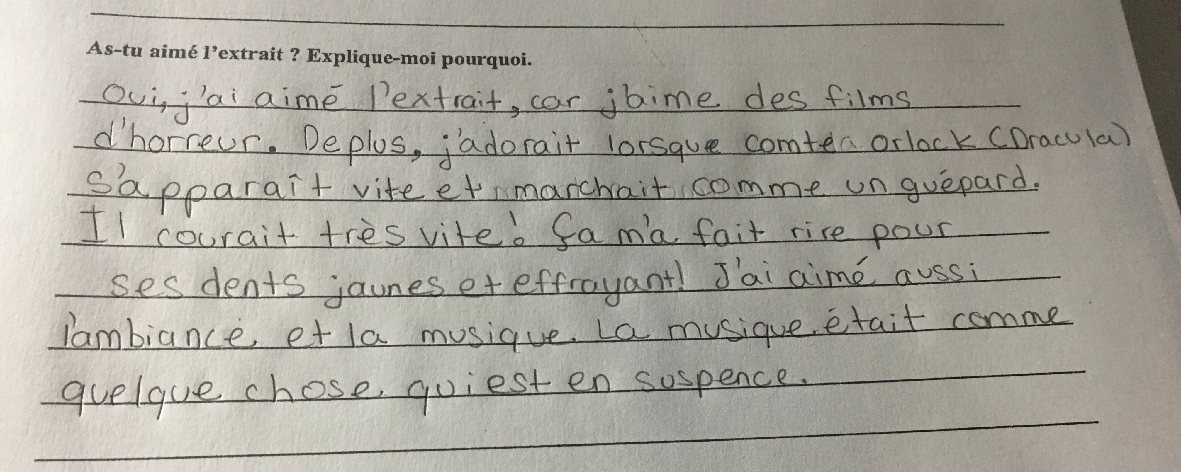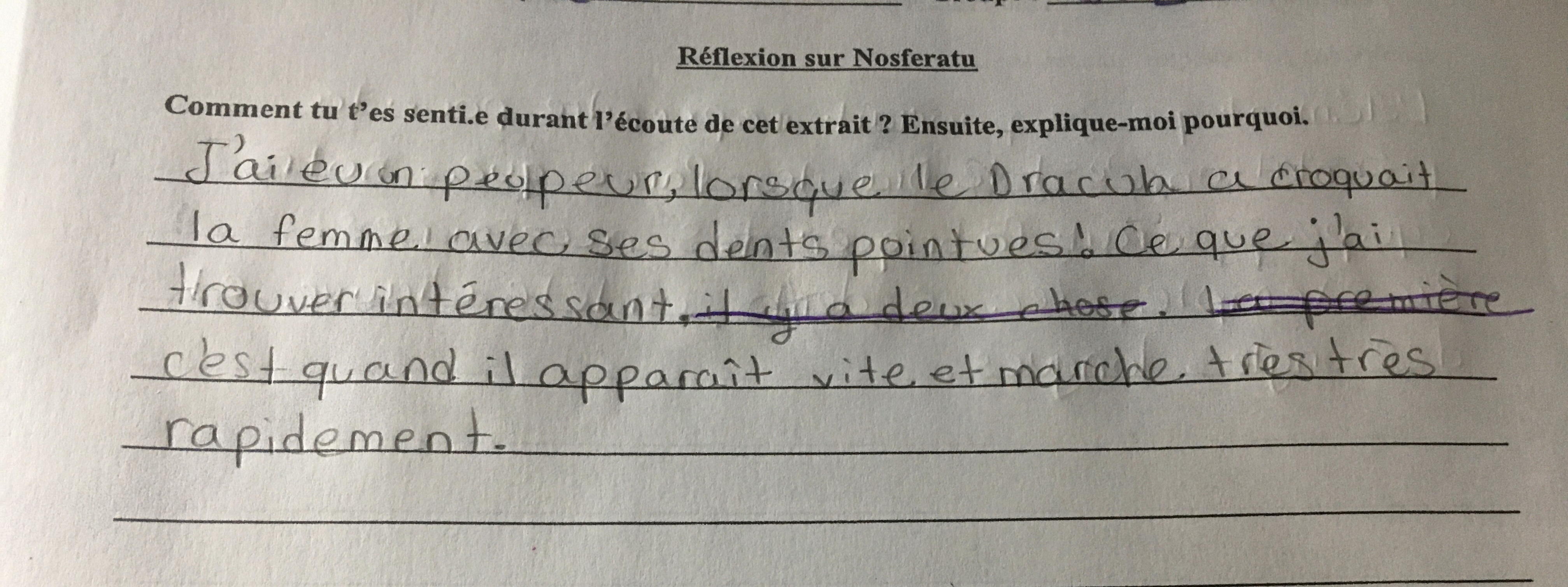 Mon enseignant de Art dramatique a donné un feuille d'appréaciation pour un extrait de Nosferatu. J'ai compris les questions.Mais je ne suis pas sûre avec mes réponses :( Est-ce que vous pouvez m'aider ?L'extrait de Nosferatu :et la feuille d'appréciation :Merci et Bonne journée :D