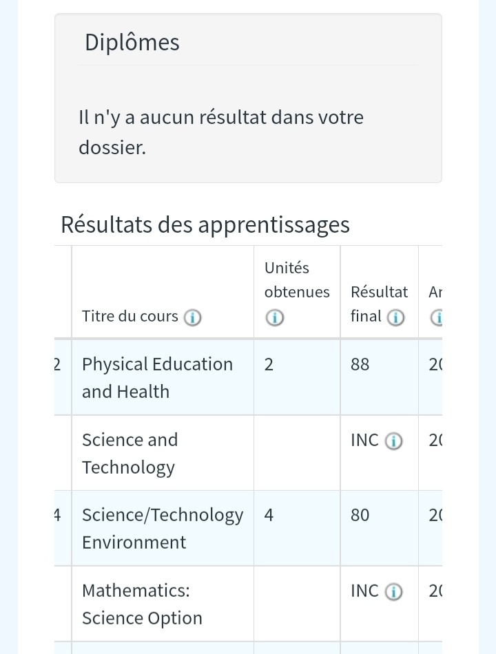 Secondaire 4 • 2aBonjour, en allant sur le site du ministère de l'éducation j'ai pu trouvé mes résultats finals mais la note de math et celles de science ne montre pas, c'est de même pour mon diplome. Que dois je faire?