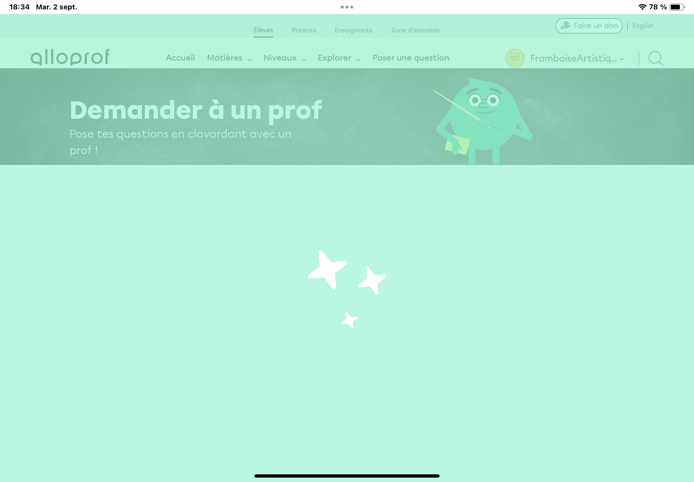 Vous allez bien? Malheureusement, je pense que votre site a un petit bug! Je tente de parler avec un prof, mais cela ne fonctionne pas, autant sur mon iPad (ce compte ci) que sur mon autre compte, sur mon téléphone. Il y avait également un autre élève qui a mentionné ce soucis tantôt. Un prof lui a répondu. Donc, je vais envoyer un message à votre équipe!