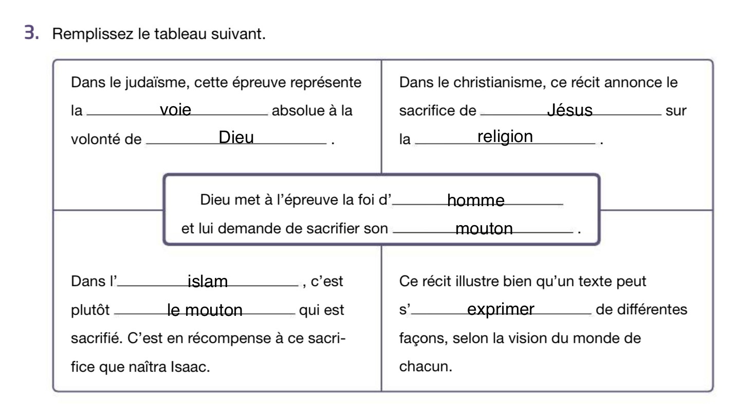 Secondaire 5 • 3aBonjour, je suis en secondaire 5 et le cours c'est ECR ( Éthique Et Culture Religieuse). Est-ce que vous pouvez me donner un indice pour le bloc à gauche qui commence par ''Dans l'...., c'est plutôt... qui est sacrifié. C'est en récompense à ce sacrifice que naîtra Isaac.'' Cela sera très aimable de votre part.