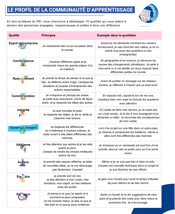 En fait, j'ai trois questions à vous poser, car j'ai absolument besoin de votre aide.1)Que veut dire l'ouverture d'esprit ( Qualité du profil de l'apprenant ) dans PEI ?2)Pourquoi est-ce l'ouverture d'esprit est important dans le monde ( dans notre société ) ?3)Comment est-ce que l'ouverture d'esprit impact la vie des autres ? ( Merci beaucoup àGalaxieLambda6093de m'expliquer en détail, mais je n'ai pas compris, est-ce que ce serait possible de m'expliquer avec des mots faciles s.v.p si cela ne vous dérange pas ? )