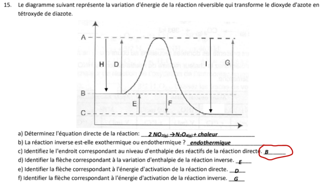 Je ne comprends pas pourquoi B serait l'enthalpie des réactifs puisqu'il est plutôt situé au point de départ de l'équation... Je pensais que c'était A parce que c'est le complexe d'activation, donc l'énergie dont ont besoin les réactifs?