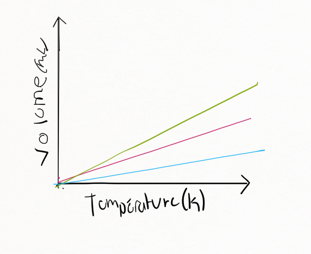 Secondaire 5 • 3aBonjour, j'ai une question de chimie. On a un graphique initiale (rouge), qui indique le volume en fonction de la température en Kelvin. Ensuite, on indique que la pression a augmenter, alors quelle serait le nouveau graphique, le vert ou le bleu?Merci!