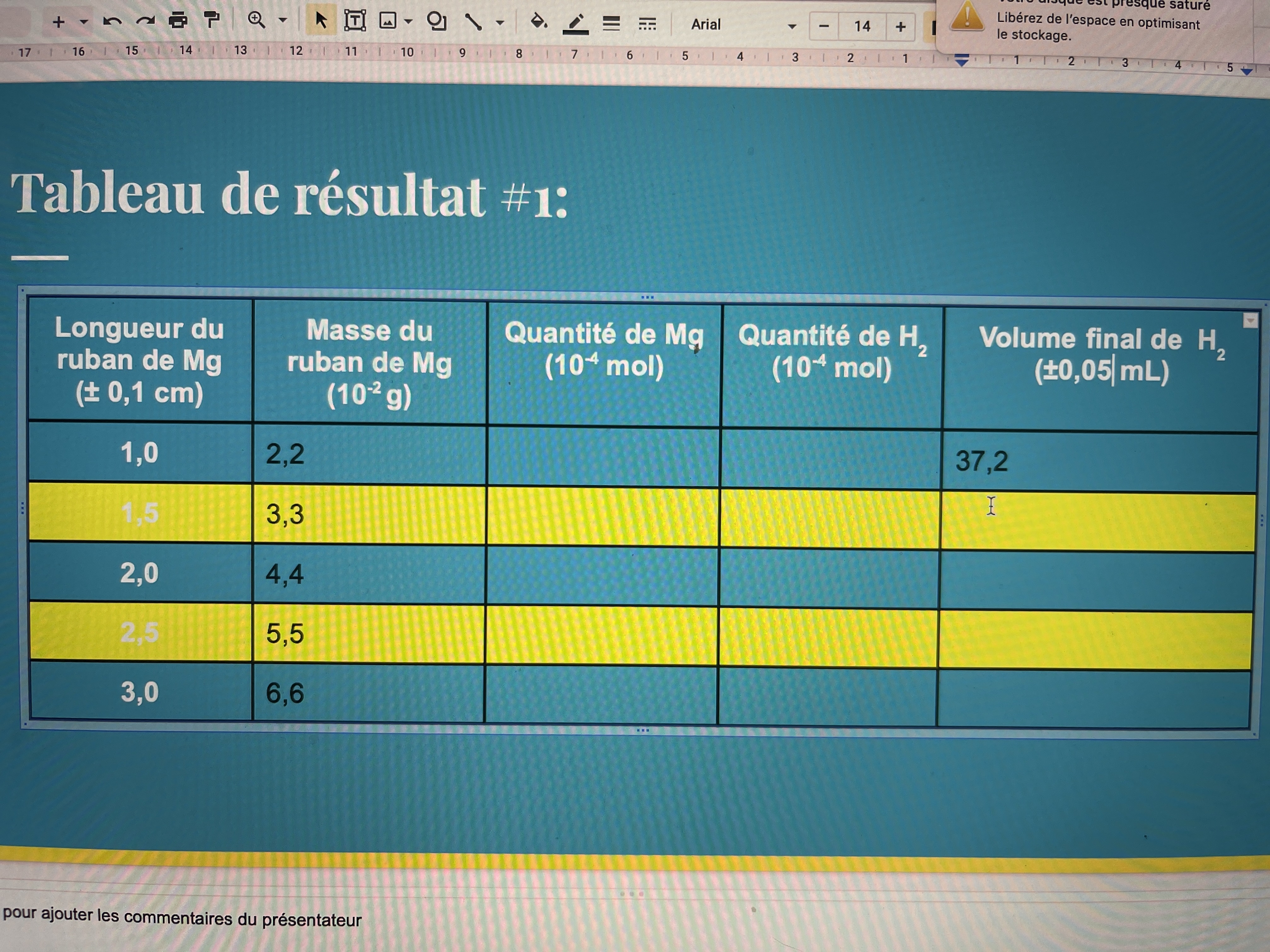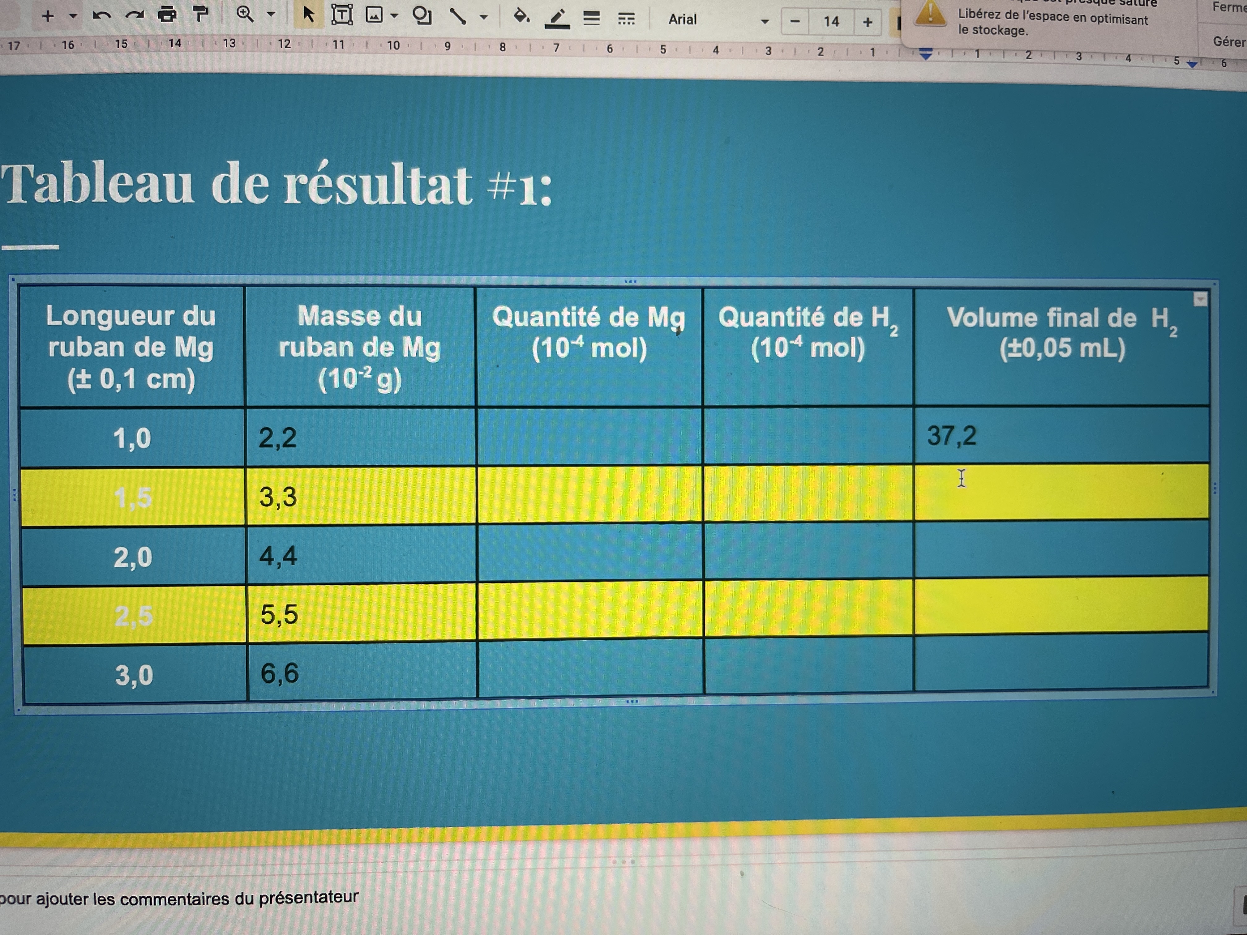 je voulais juste savoir comment je peux faire pour trouver la quantité de H2 (10 à la moins quatre mol) lorsqu’on mélange 1,0 cm (0,02194g)de Mg dans du HCL?