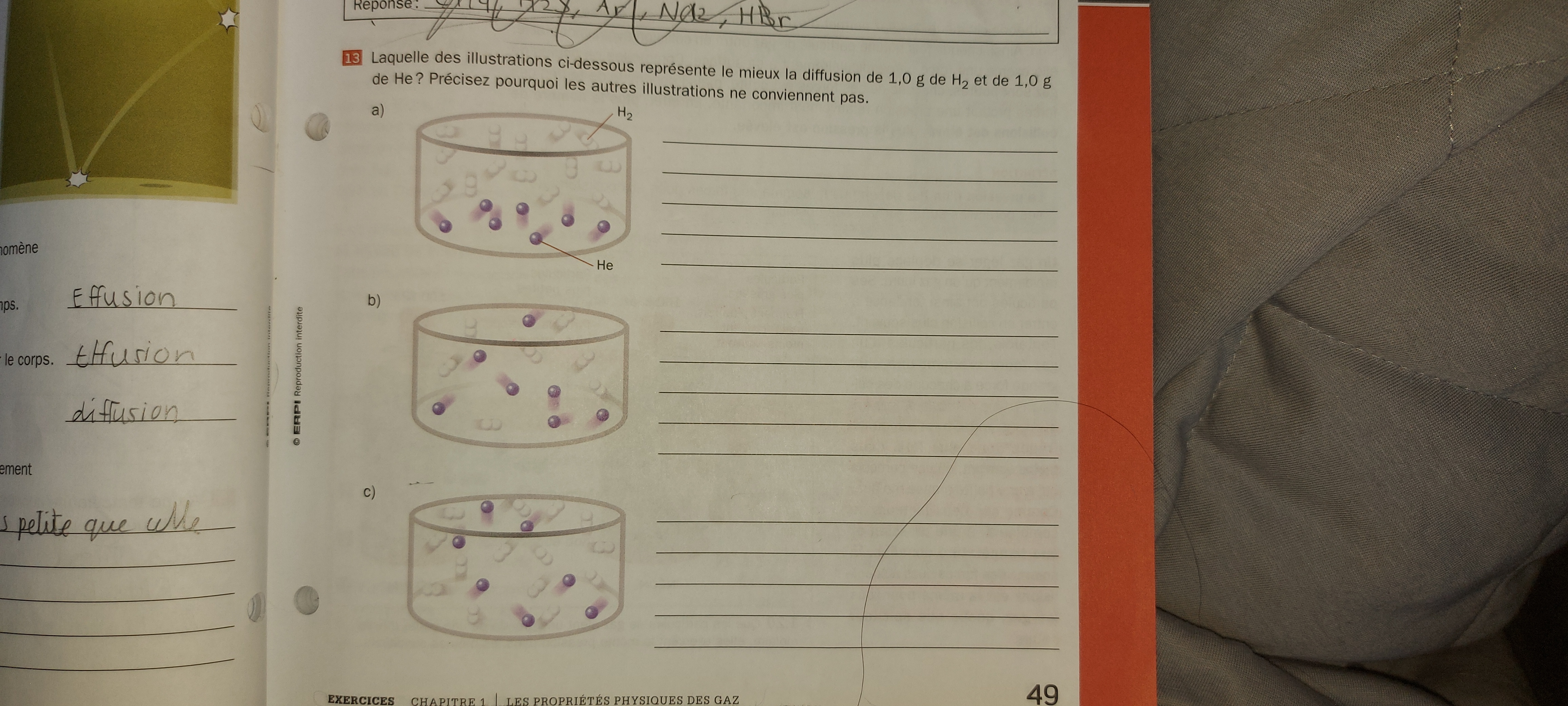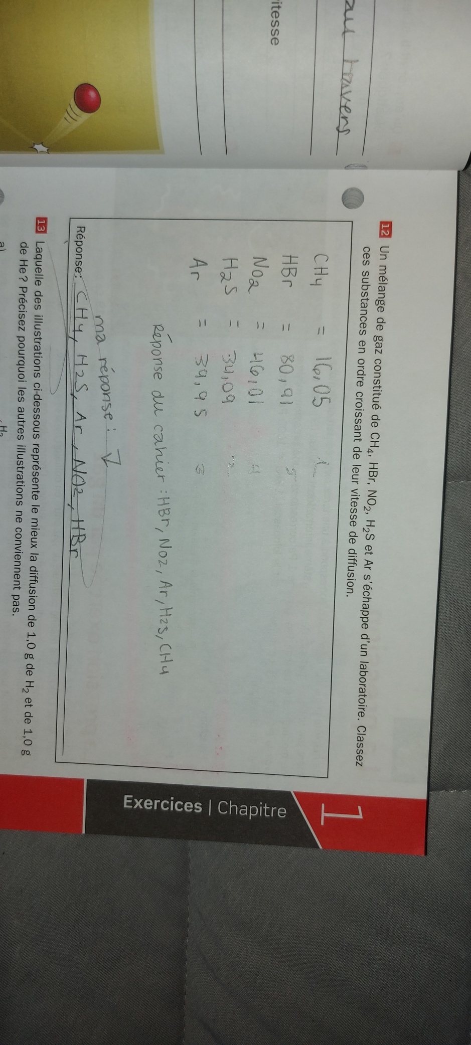 Secondaire 5 • 3aJe ne comprends pas la vitesse de diffusion des gaz dans le chapitre 1, on dit que plus la masse molaire est petite plus le gaz va vite et inversement mais les réponses de mon cahier me mélangent puisqu'elles sont l'inverse