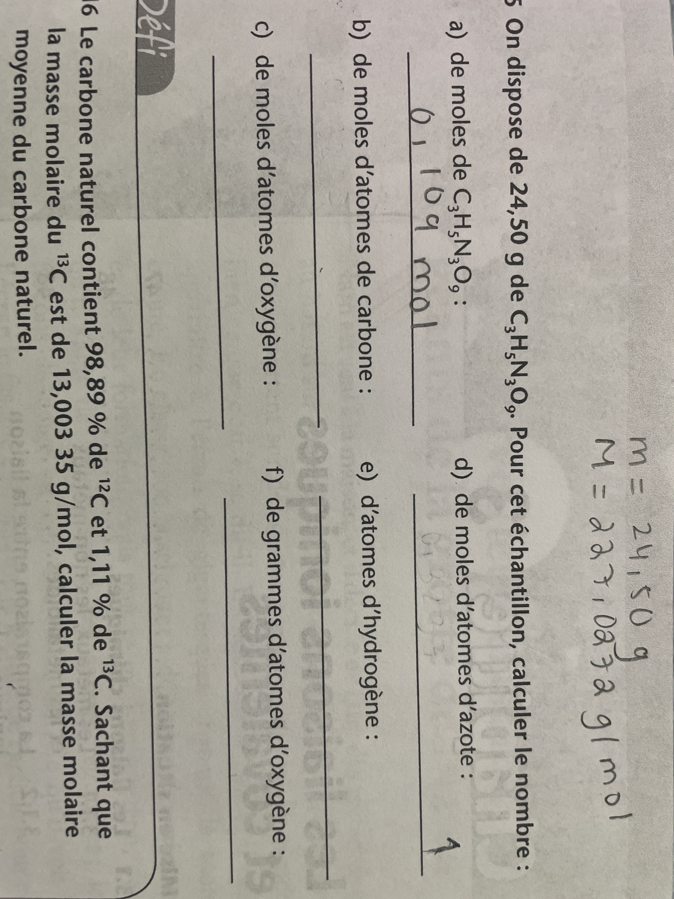 Secondaire 5 • 3aJ’aurais besoin d’aide pour cet exercice svp. Comment je fais pour calculer le nombre de moles pour le carbone, l’oxygène, l’azote et l’hydrogène séparément?