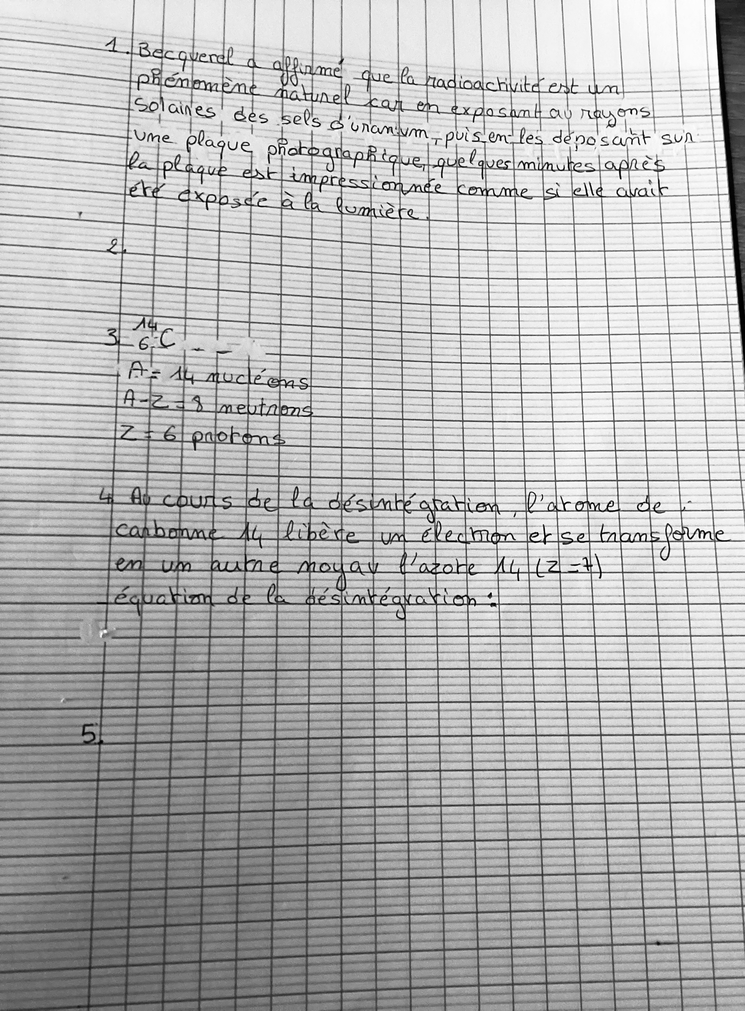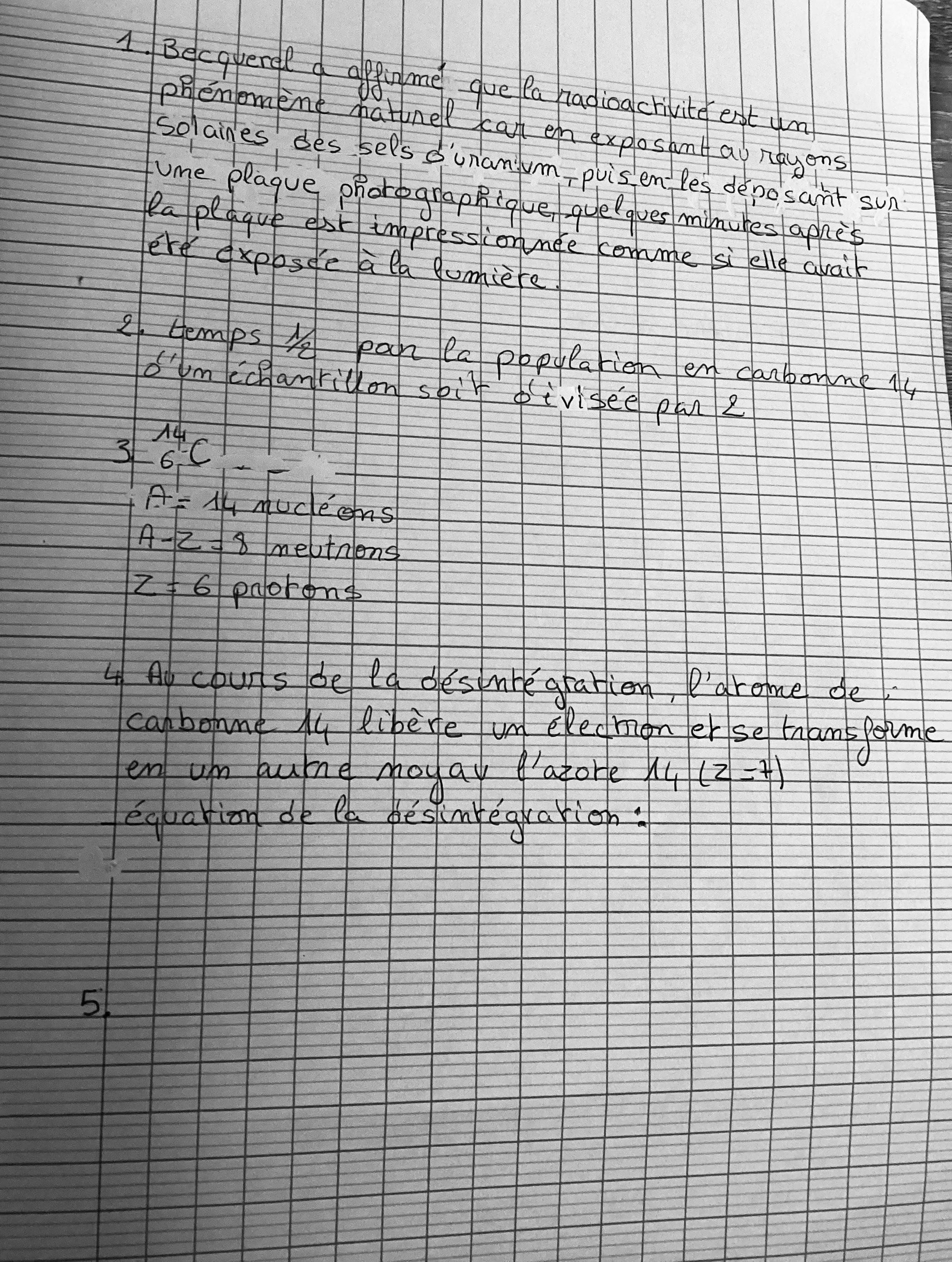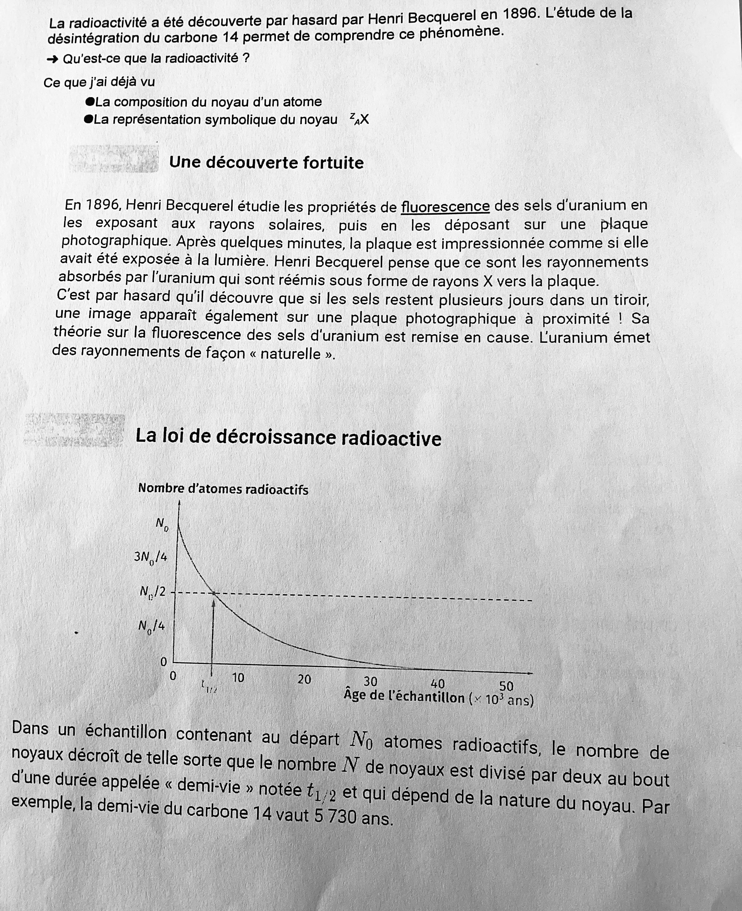 Secondaire 5 • 3aBonjour vous pouvez me dire svp si la réponse question 1) que j’ai écrite pour l’observation de Becquerel est bien formulé, par contre la 2) je n’arrive pas je si on doit utiliser un calcul ou bien retrouver le temps sur le graphique, la 3) je pense que c bon et pour la 4 j’ai pas réussi à faire l’équation. Et pour la 5) je sais pas comment je peux expliquer