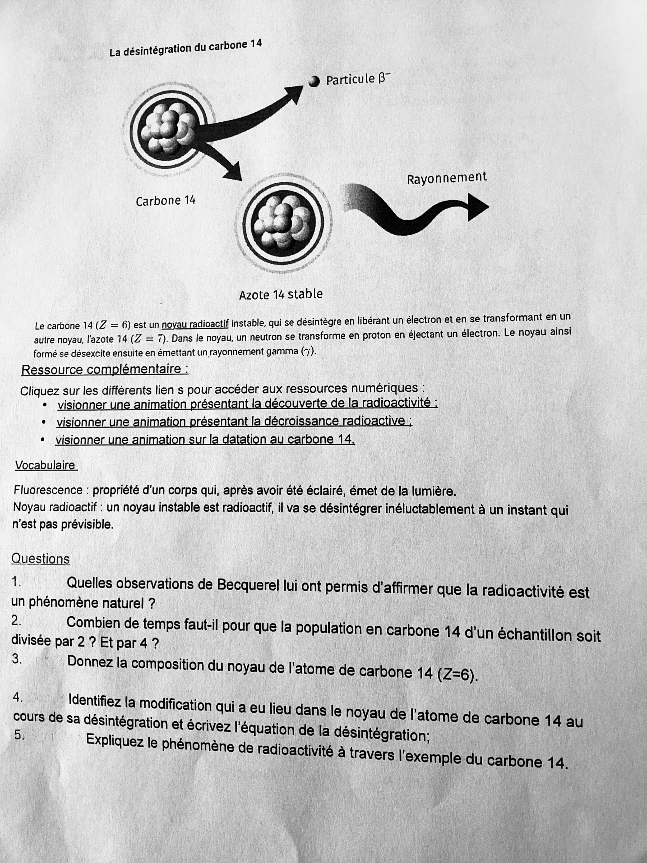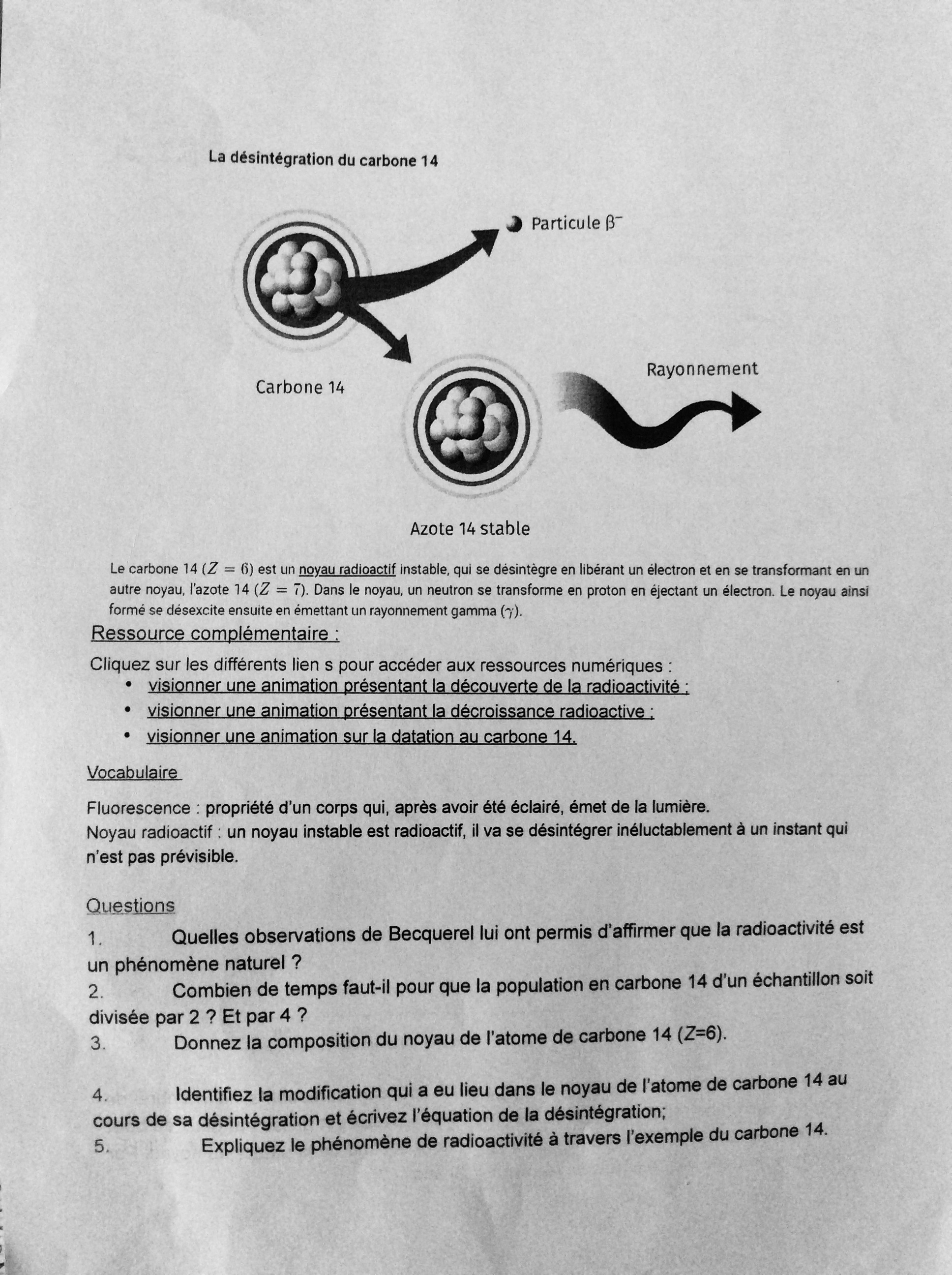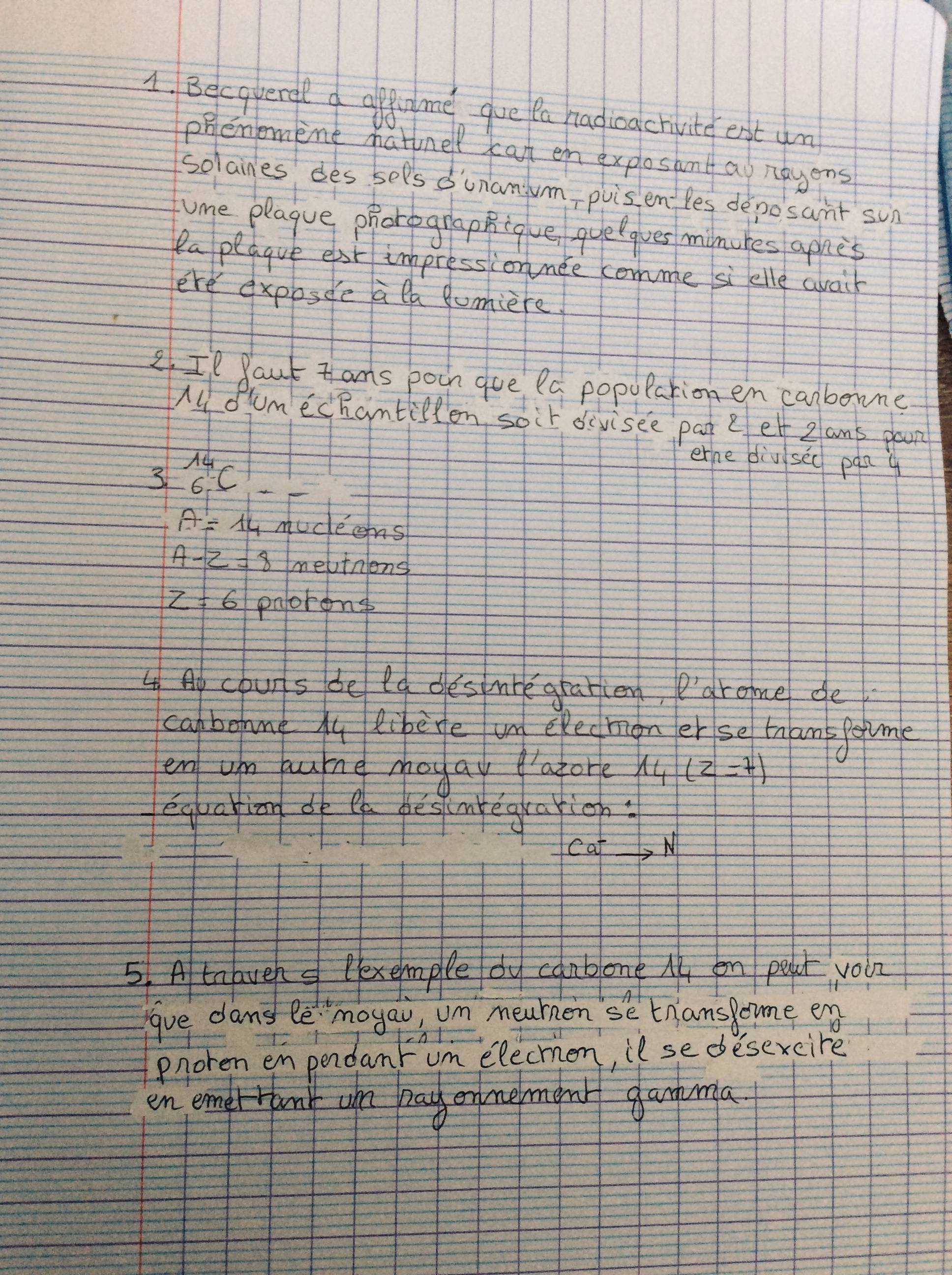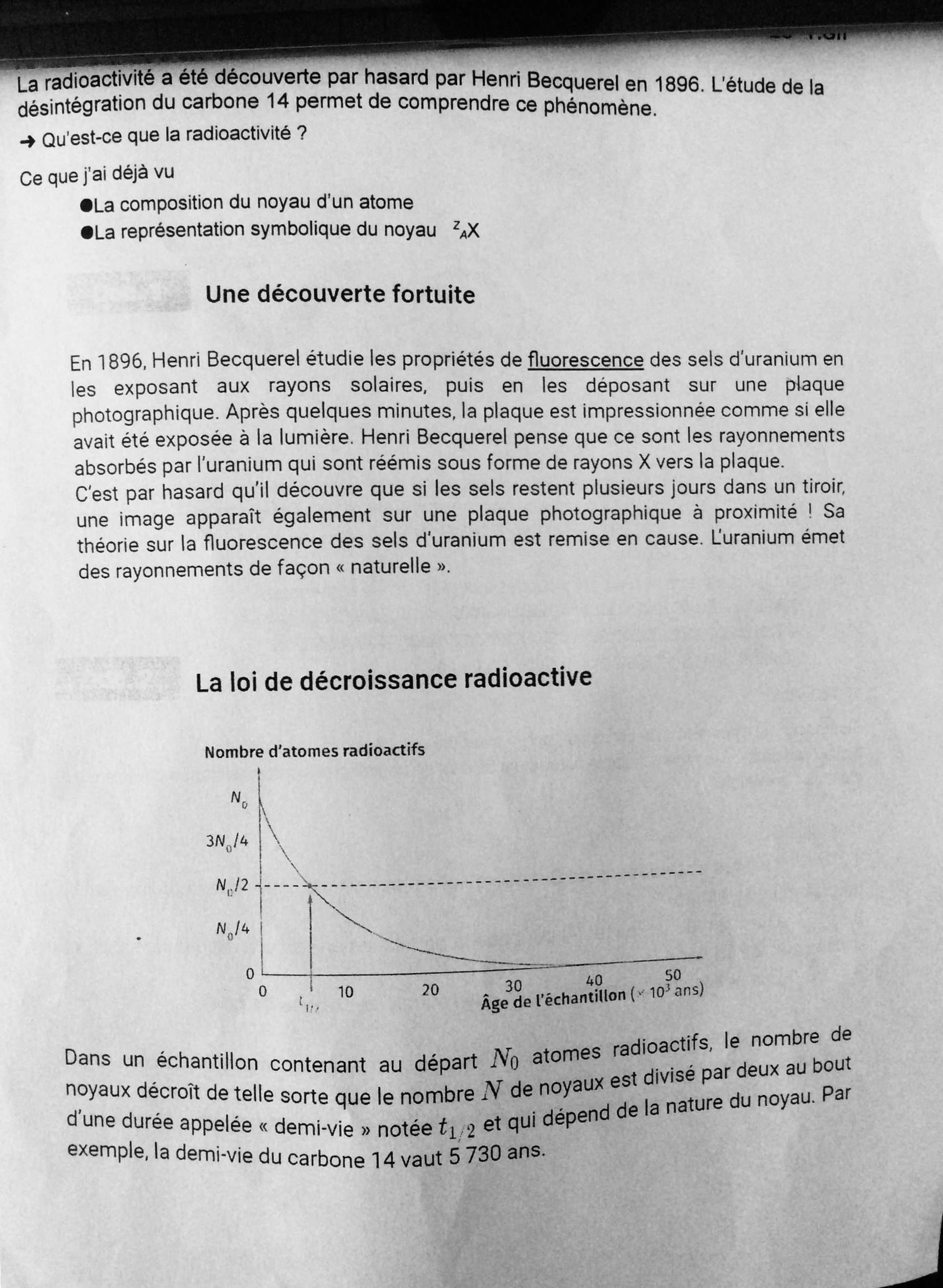 Secondaire 5 • 3aBonjour vous pouvez me dire svp si la réponse question 1) que j’ai écrite pour l’observation de Becquerel est bien formulé, par contre la 2) je n’arrive pas je si on doit utiliser un calcul ou bien retrouver le temps sur le graphique, la 3) je pense que c bon et pour la 4 j’ai pas réussi à faire l’équation. Et pour la 5) je sais pas comment je peux expliquer