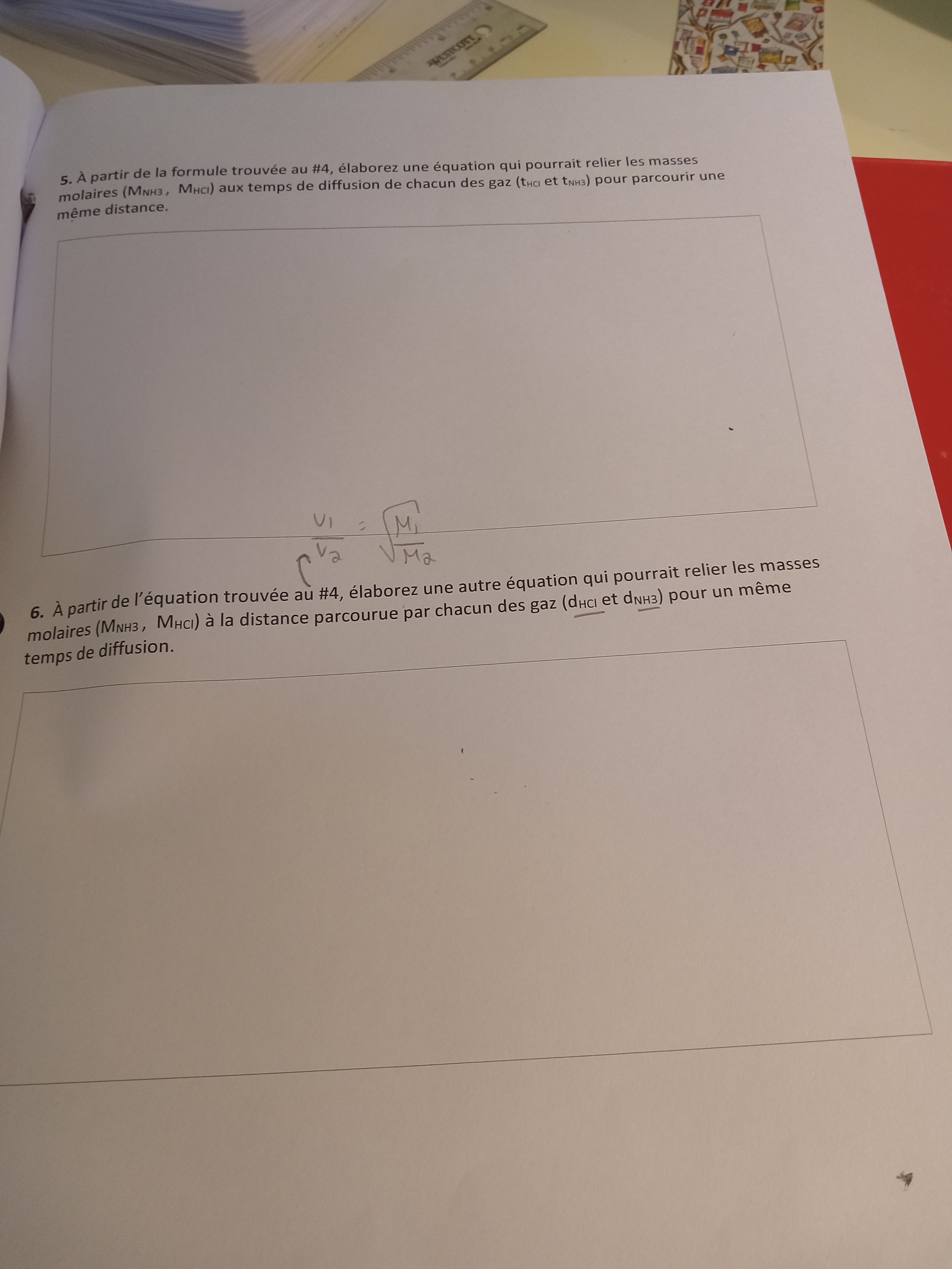 Secondaire 5 • 3aBonjour, je me demandais quelles sont les formules qui relient les masses molaires aux temps de diffusion de deux gaz, et ce pour parcourir une même distance. De plus, je me demandais quelle était l'équation qui pourrait relier les masses molaires à la distance parcourue par chacun des gaz, et ce, pour un même temps de diffusion. Je ne comprends aussi pas comment je suis supposée trouver le point de rencontre des deux gaz, qui ont une vitesse différente. Merci!