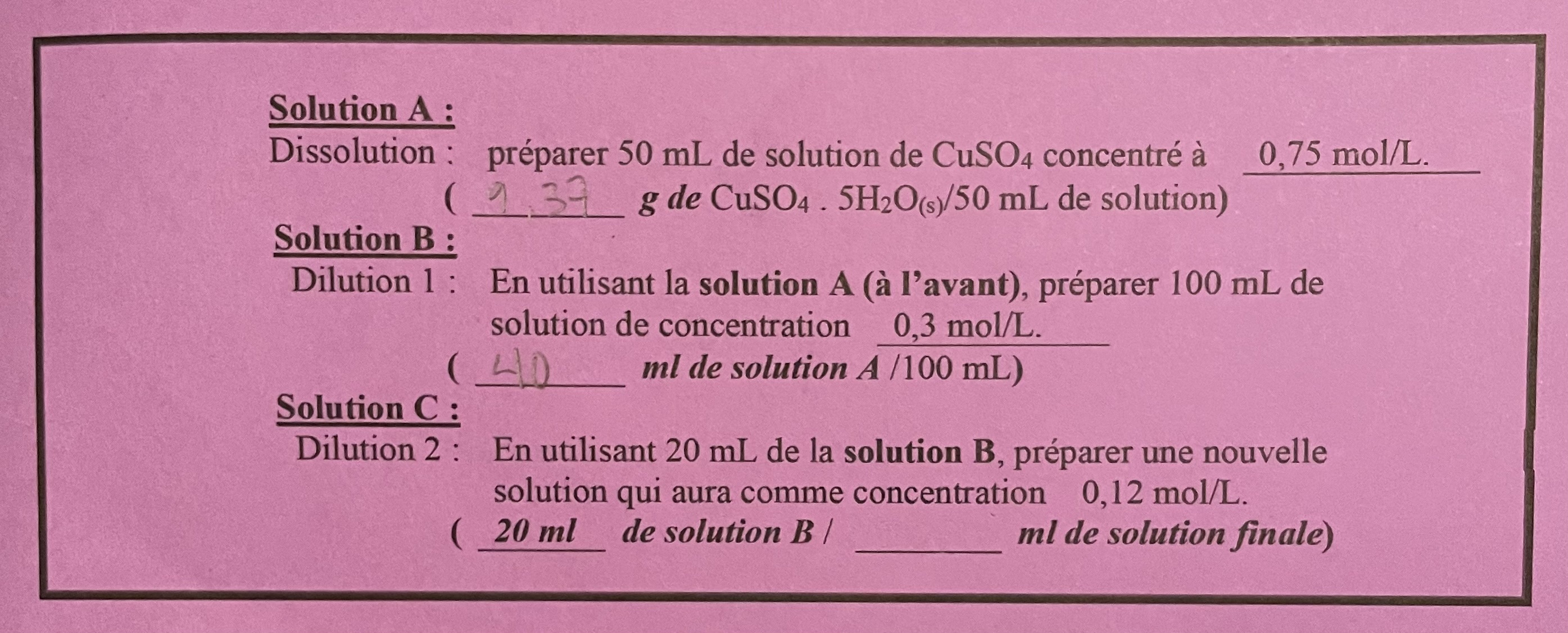 Secondaire 5 • 3aBonjour, je dois faire créer 100 ml d'une solution du CuSO4 à 0,1 mol/L pour un laboratoire mais je ne suis pas sûre des démarches pour y arriver. Pouvez-vous m'aider?