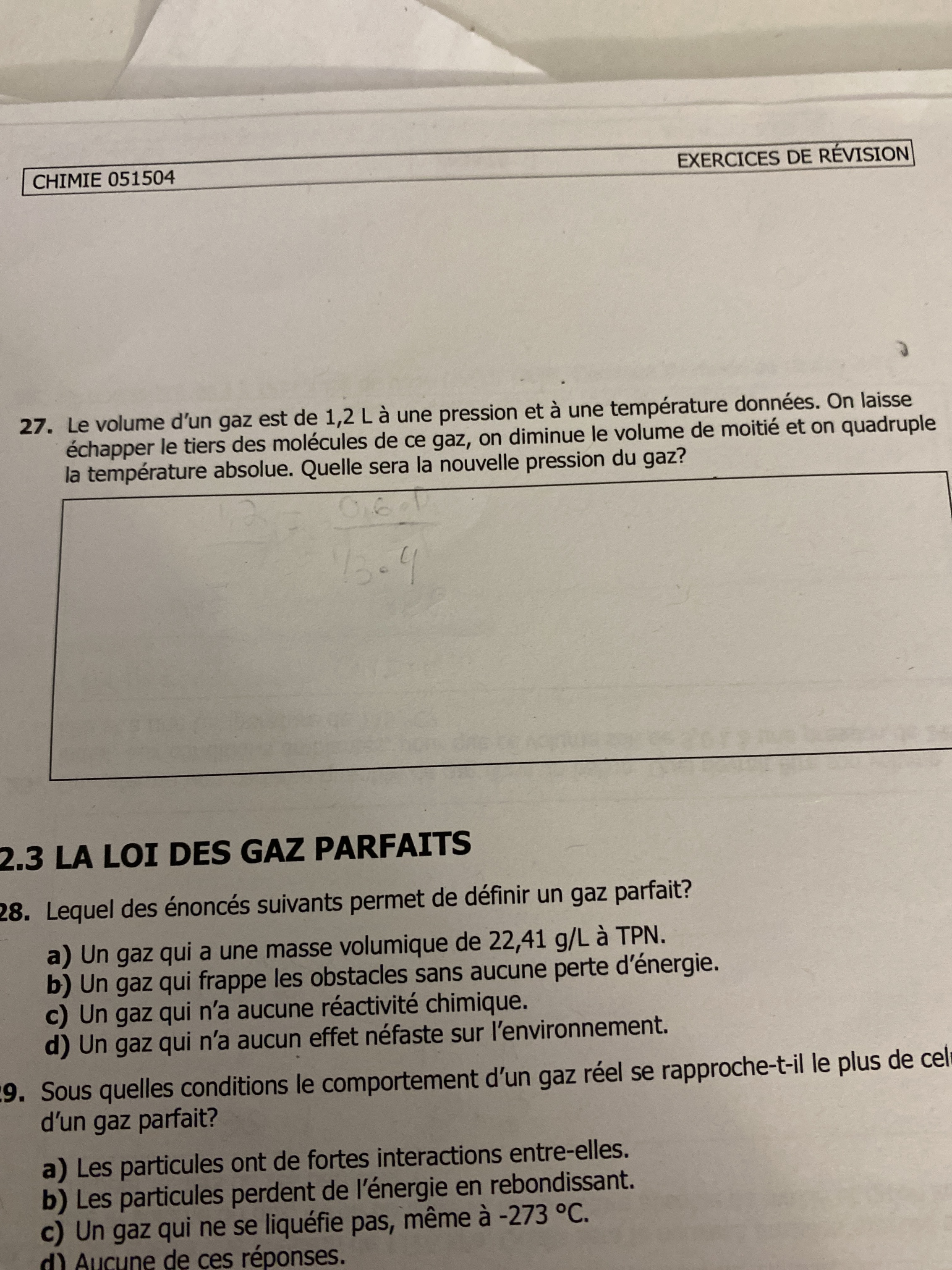 Pour ce numéro je suis un peu perdue, j'ai essayer d'utiliser la formule n=m/M et la formule V/T = V/T. Sauf que ça n'a pas fonctionné.