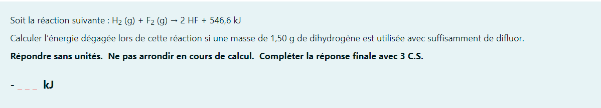 Secondaire 5 • 3aJe ne suis pas certain de savoir comment résoudre ce numéro. Je pensais calculer le nombre de mole de dihydrogène pour 1,50g, multiplier par 2 pour trouver le nombre de moles de HF et trouver la masse du HF à partir de sa masse molaire. Mais, je n'y arrive pas.
