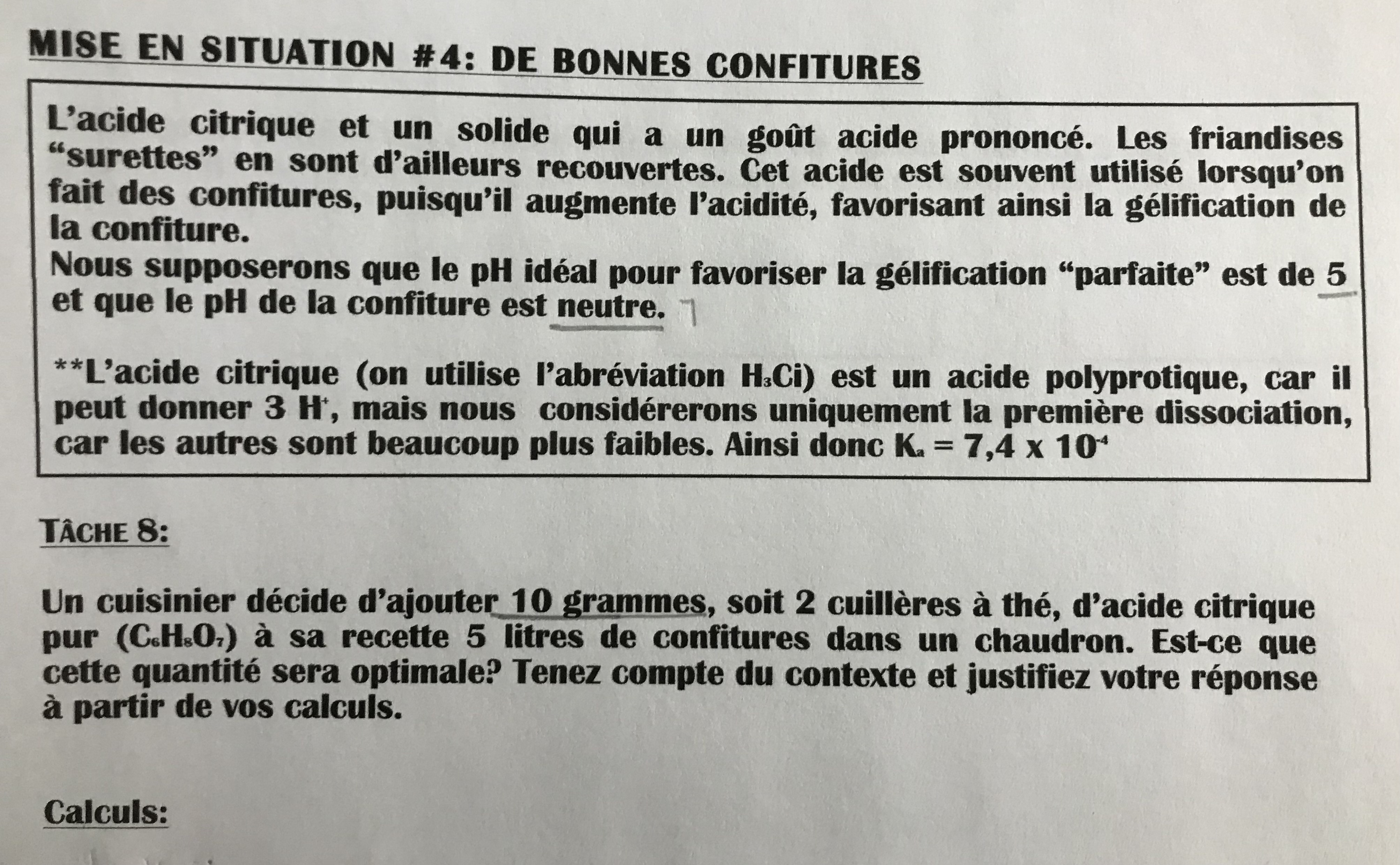 Secondaire 5 • 3aBonjour, j’ai cette question et je ne sais aucunement comment par quoi commencer. Toute les informations disponibles pour faire le numéro sont présente dans la photo. Je comprend que le PH de la confiture est de 7 au début et quond rajoute 10gr d’acide citrique dans le but de faire descendre le pH idéalement a 5. Le Ka est donné et est de 7,4x10 à la -4.