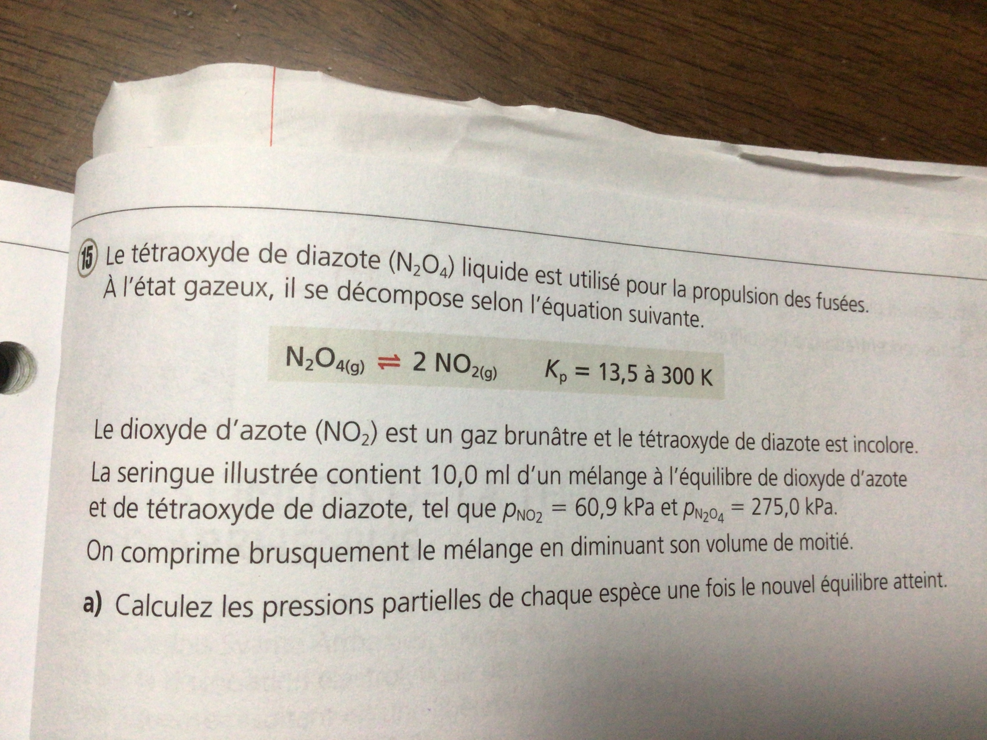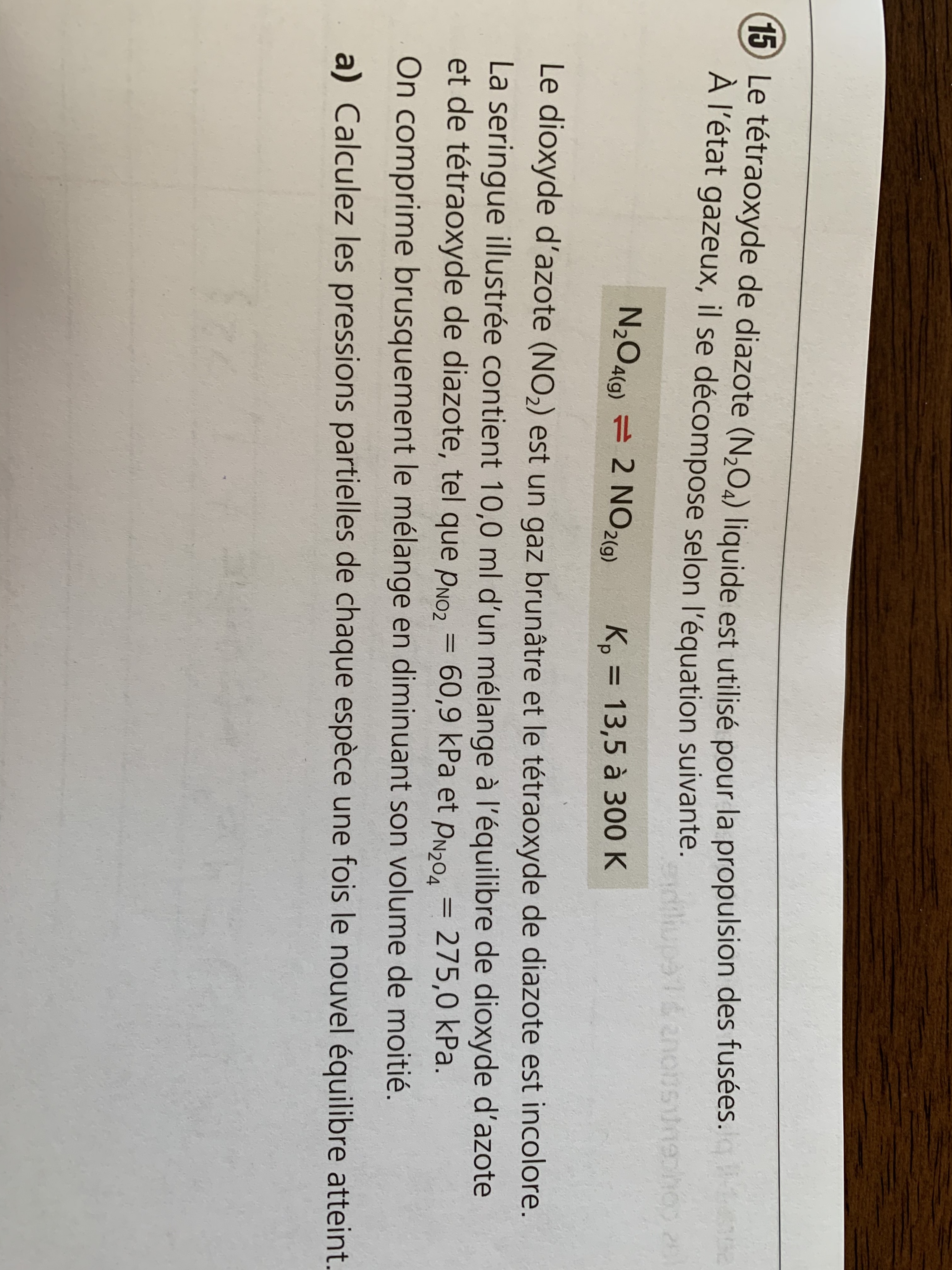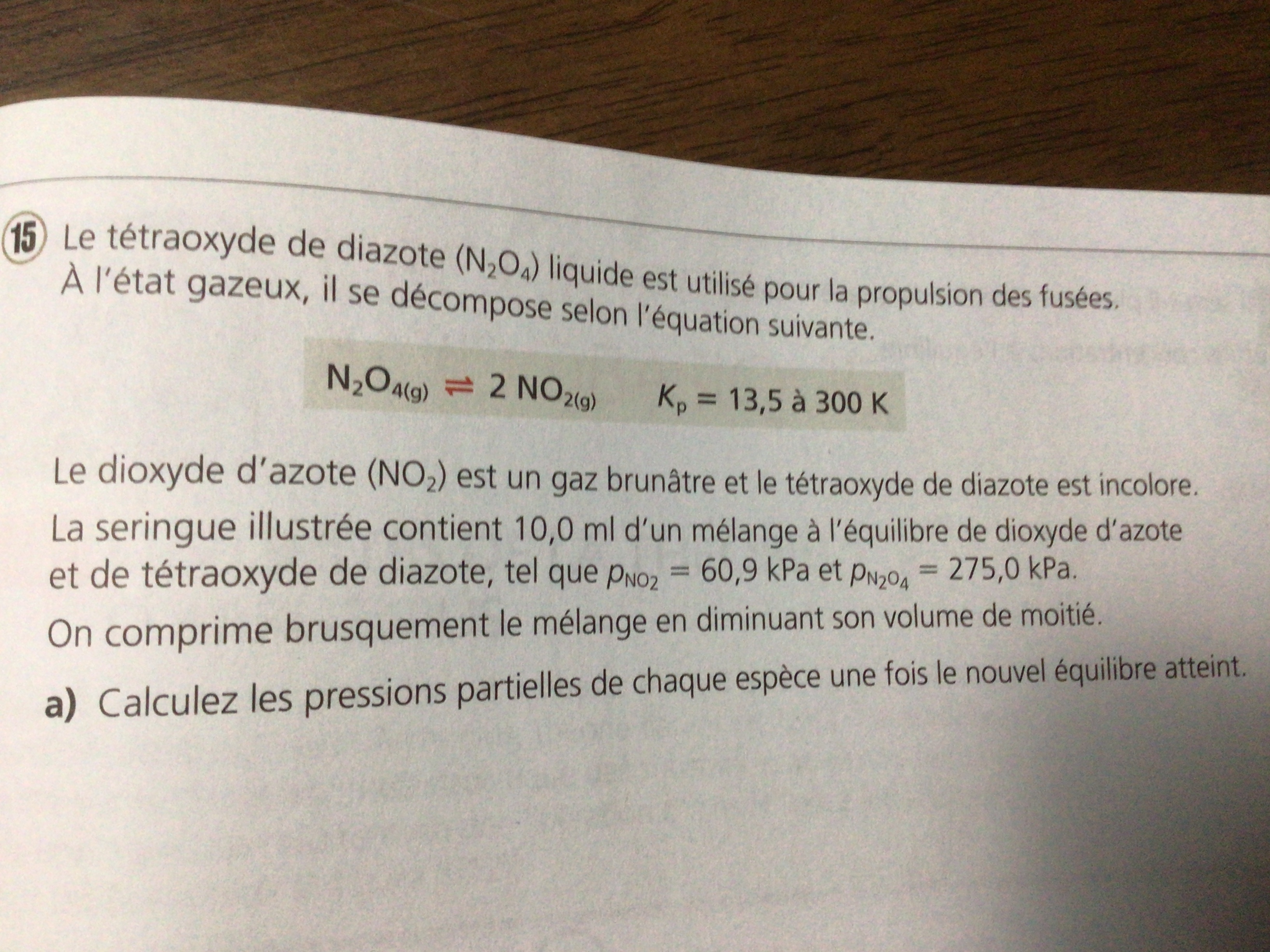Voici le numéro, je n’arrive pas à résoudre la lettre b et la réponse à la lettre a est : [N2O4] = 567,145 kPa et [NO2] = 87,51 kPa