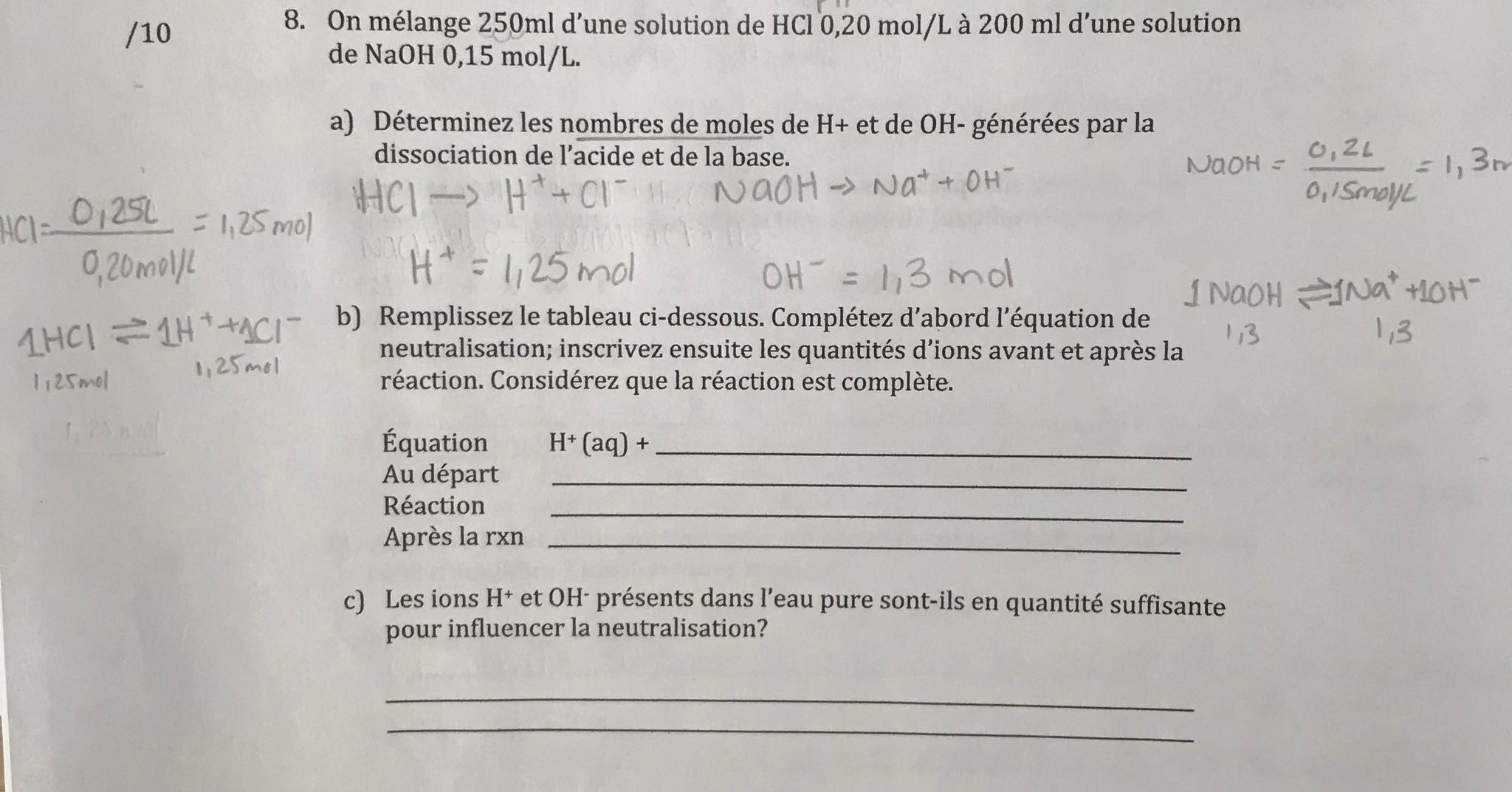 Hier, j'ai posé une question de chimie, et M. Anthony m'a répondu. Or, ce que je ne comprends pas, c'est pourquoi vous me demandez de trouver l'équation de dissolution du HCl. Je ne comprends pas aussi pourquoi les produits des 2 équations de dissolution constituent les réactifs de la neutralisatio. Autrement dit, j'ai compris comment résoudre le problème, mais je ne comprends pas la logique derrière ces étapes. Merci!