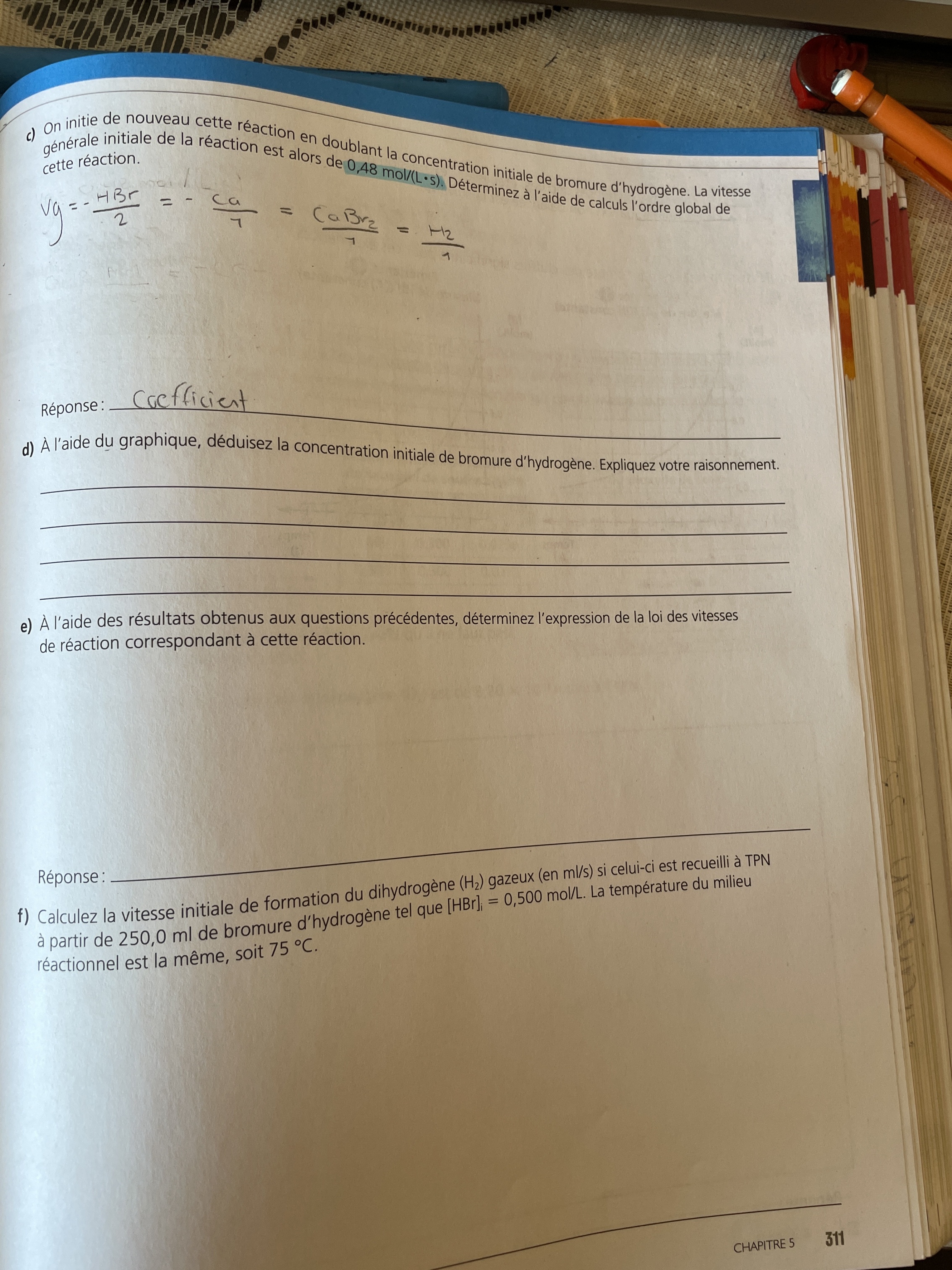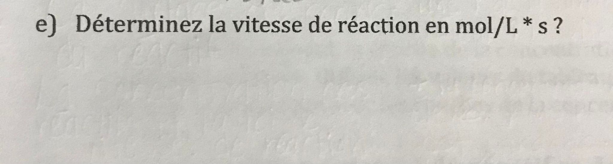 J'ai cette question et pour le point c) je ne trouve pas quel information je dois utiliser pour faire le calcul. De plus, pour le point e), je ne comprend pas comment trouver la réponse puisque on ne me donner aucune concentration dans les données du numéros.