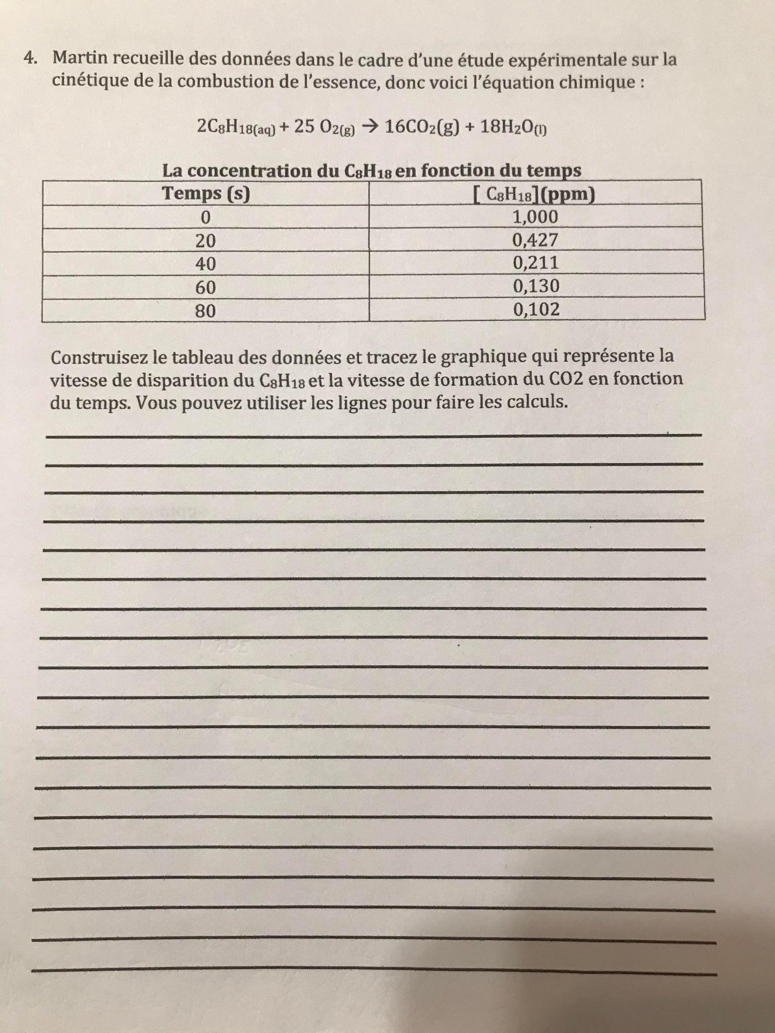 J'ai cette question et j'ai de la difficulté a cerner ce que je dois faire avec les données qu'ils me donnent, surtout que la concentration du C8H18 est en ppm.