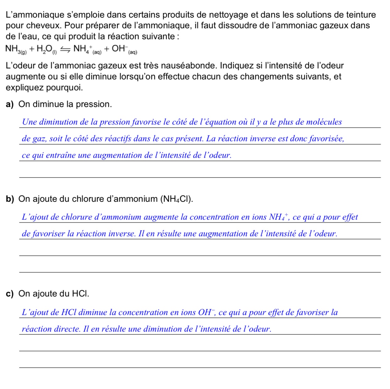 Secondaire 5 • 3aBonjour. Je ne comprends pas la réponse du numéro c). Comment l’ajout de HCl diminue la concentration d’ion OH-?
