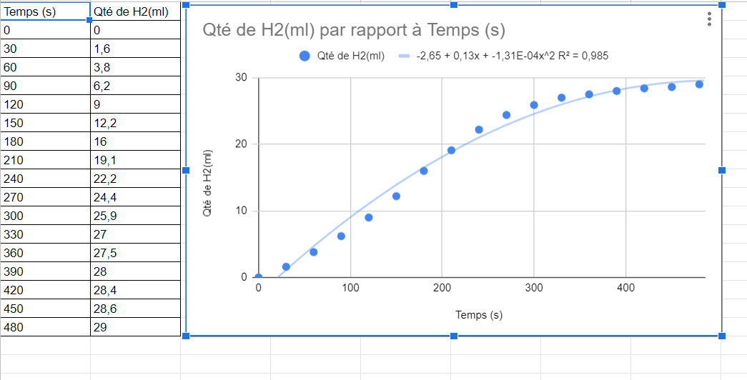 Secondaire 5 • 3asi j'ai un tableau avec des quantités de H2 en ml, mais que je les veux en nombre de moles, c'est quoi que je dois faire?Vu que c'est un gaz au lieu de l'eau, est-ce que je peux quand-même transformer les ml en g? On m'a dit que je devrait peut-être utiliser la farmule TAPN? Comment je fais ?