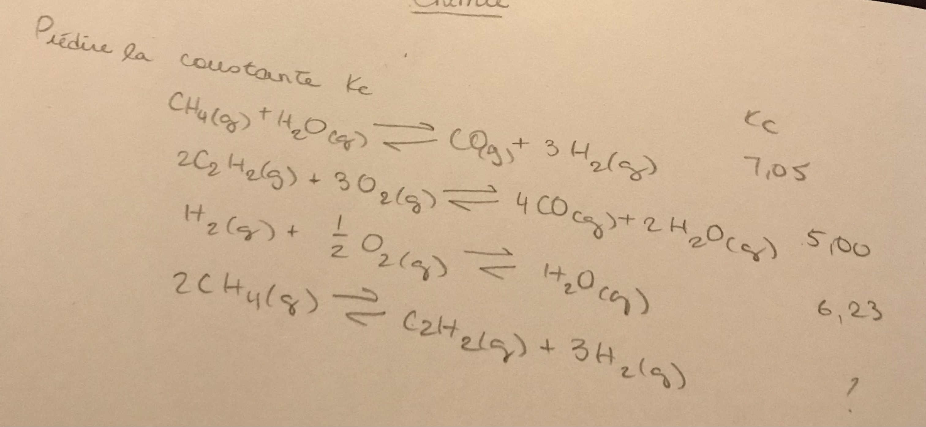 Secondaire 5 • 3aBonjour, je ne comprends pas comment trouver le Kc de la deuxième équation chimique. J’ai seulement la constante d’équilibre de la première.