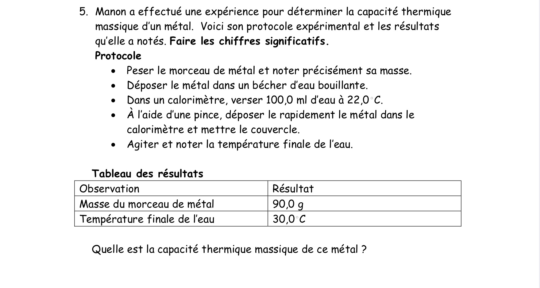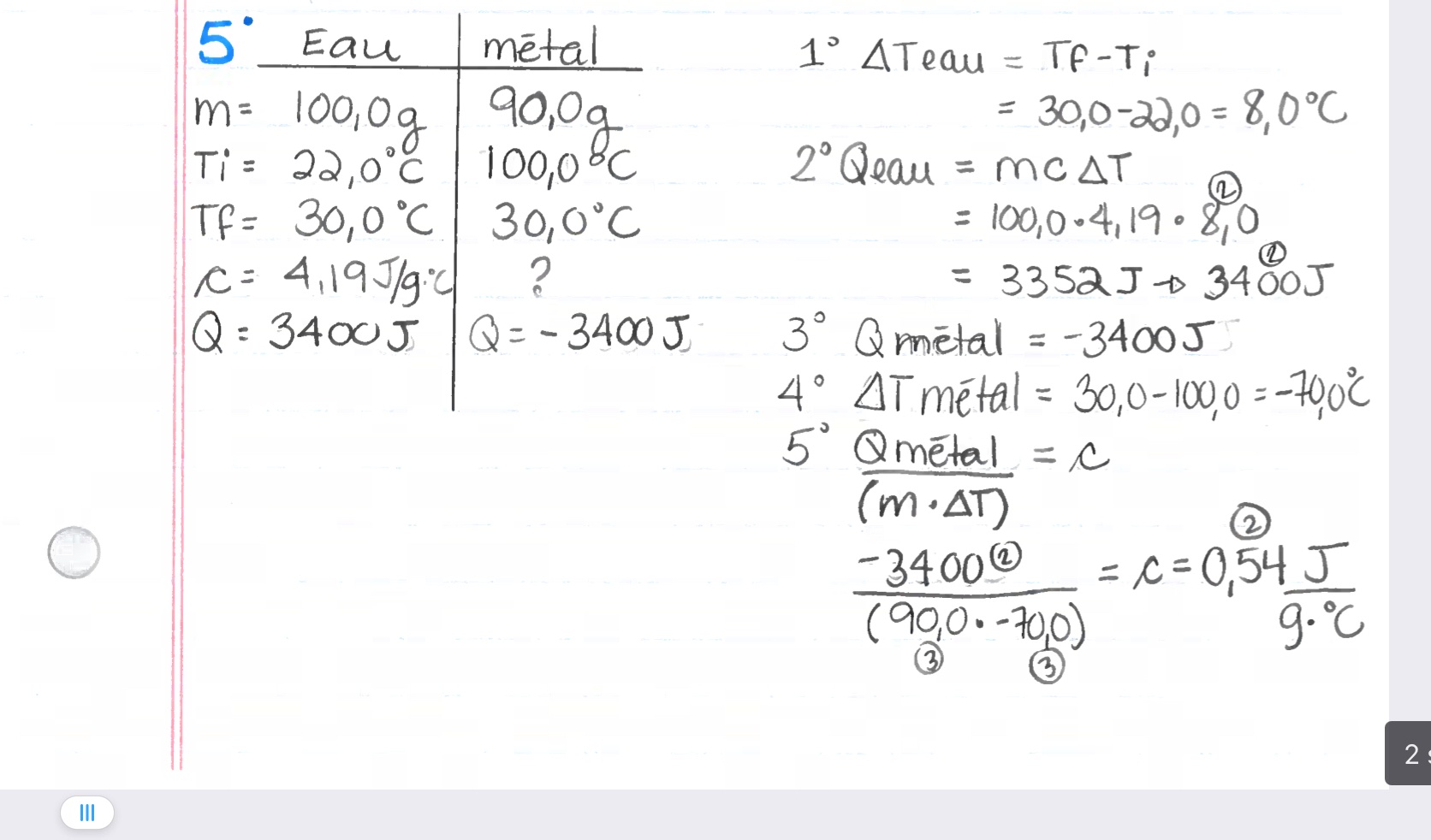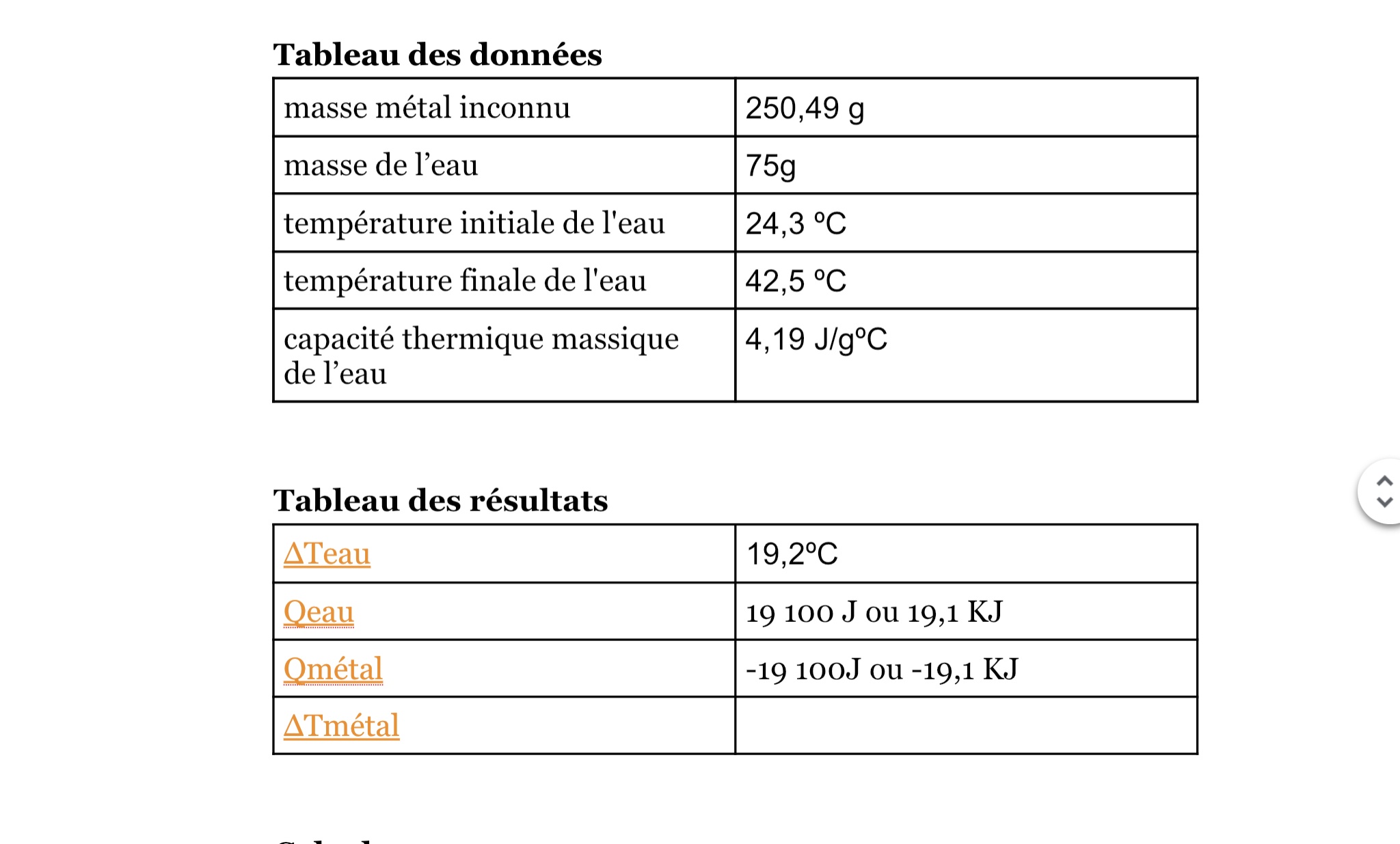 Secondaire 5 • 4aBonjour, j'ai un problème à résoudre en chimie sur les calculs calorimétrique. Je n'arrive pas à comprendre pourquoi dans le corrigé ils mettent 100ºC comme température initiale au métal inconnu alors que cette donné n'est pas écrit dans le problème. Je dois avoir oublié une règle puisque je ne comprend vraiment pas la logique. Est-ce qu'il faut prendre la masse de l'eau et la transformer en ºC pour la température initial du métal?