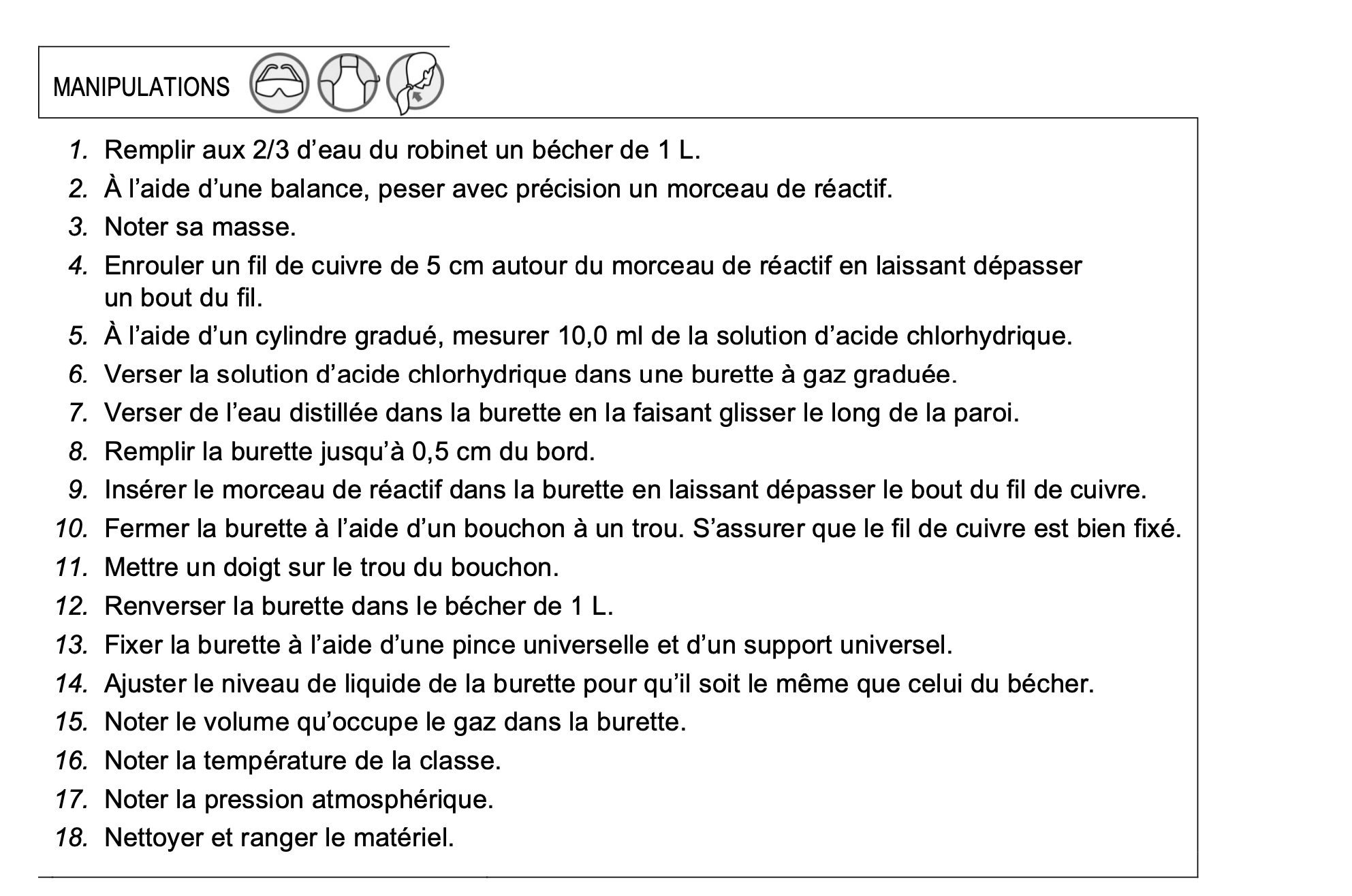 En gros ce qu’il faut faire c’est de remplir un bécher avec de l’eau. Il faut ensuite prendre un long tube en verre gradué et le remplir avec de l’eau pour ensuite le suspendre à l’envers à l’aide d’une pince dans ce bécher en le bouchant avec son pousse. L’eau du tube restera donc intact quand on débouche son pousse. Ensuite, il faut insérer un tube pliable dans le long tube en verre qui est lié au bouchon d’un contenant contenant un liquide. Finalement, il faut renverser une certaine quantité de poudre dans ce liquide et boucher le contenant en même temps. Après ces manipulations, il est possible de voir un gaz qui se crée en se rendant grâce au tube pliable dans le tube en verre. Le volume de l’eau dans tube en verre change à cause que le gaz prend place.