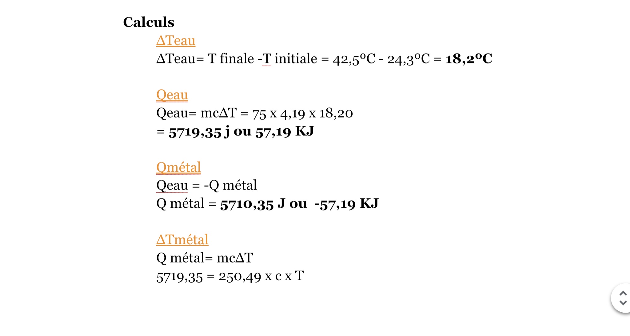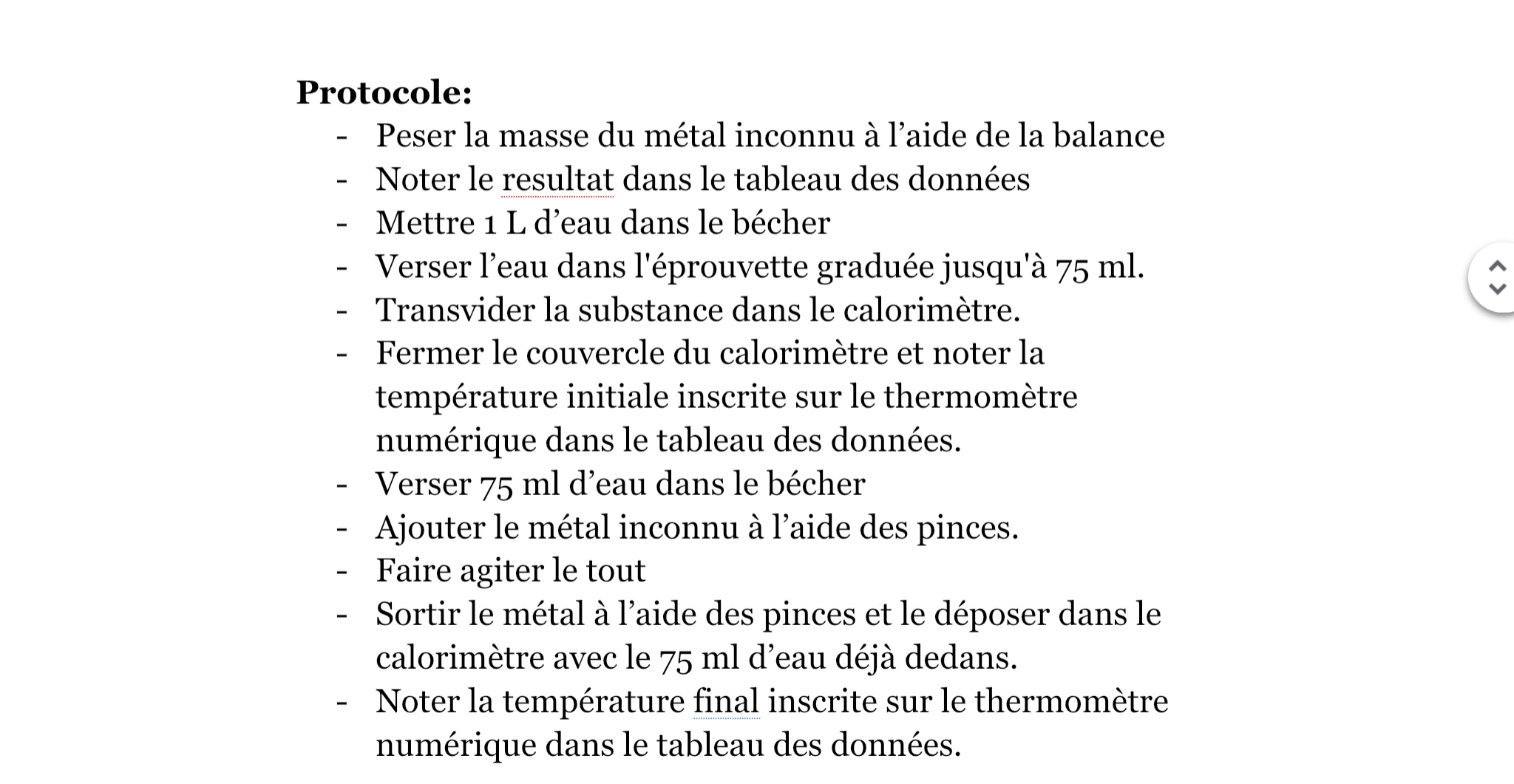 Secondaire 5 • 4aAllô, je fait une pratique de laboratoire sur la calorimétrie. Je doit trouver la capacité thermique massique du métal inconnu entre le cuivre et l'aluminium. Je ne connais pas la variation de température du métal et je ne comprend pas comment la trouver. J'ai deux valeurs inconnu dans mon calcul de la chaleur (Q). Comment je dois faire?