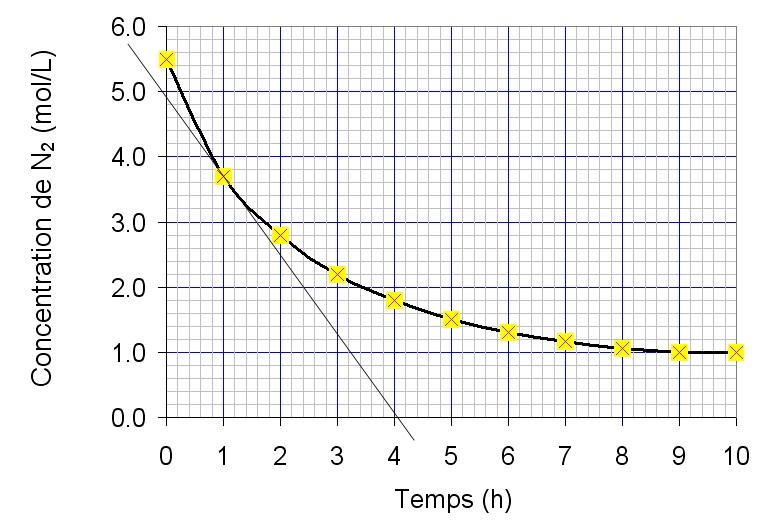Des mesures de la concentration de N2(g) ont été prises à différents moments et portées en graphique.