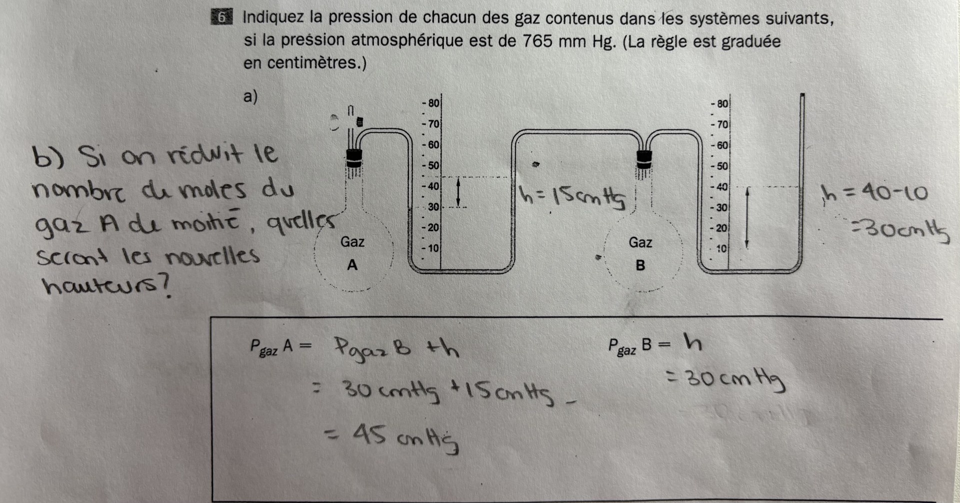 Secondaire 5 • 11mDans ce cas, est-ce que la variation du nombre de moles du gaz A affectera les deux hauteurs (entre le gaz A et B et entre le gaz B et la pression atmosphérique)?