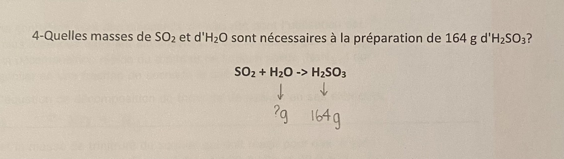 Secondaire 5 • 11mBonsoir, est-ce que dans ce problème j'ai besoin de trouver la masse molaire de H2SO3 ou je peux faire une produit-croise de g/mol? Si oui, comment est-ce que je sais quand il faut faire quoi? Merci!