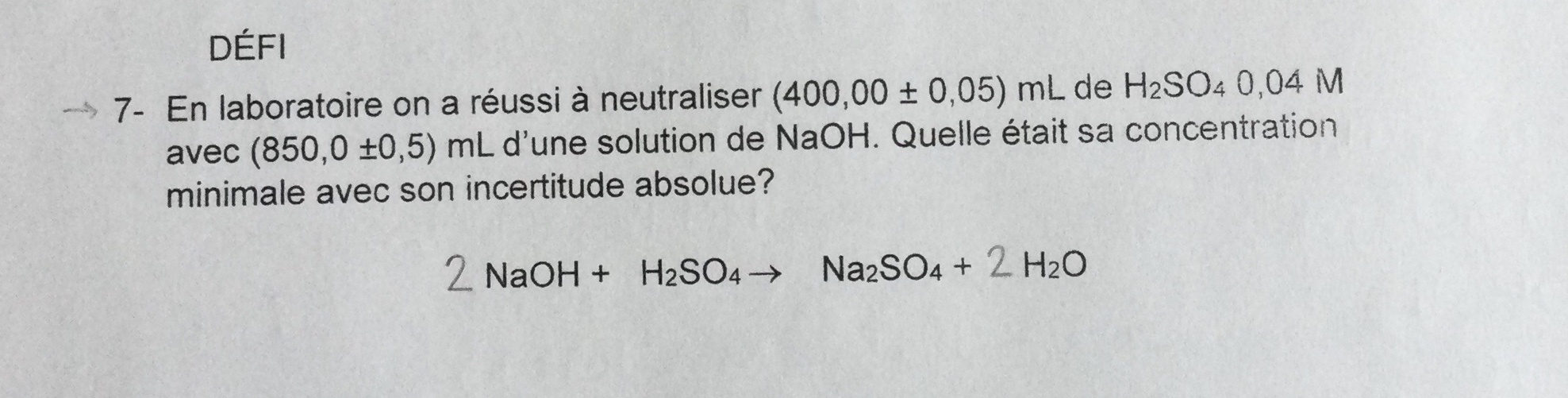 J'ai un rapport de laboratoire a remettre, mais j'ai plusieur question par rapport a cela. Le but de cette expérience est de créer une réaction de neutralisation entre un acide fort (NaOH) et une base forte (HCl). Pour ensuite déterminer la variation des concentrations à l’aide de la méthode du titrage. L’objectif est de déterminer le point d’équivalence où les concentrations seront neutres en déterminant les quantités exactes utilisées pour réaliser cette expérience. L’équation balancée serait NaOH + HCl = NaCl + H20.
