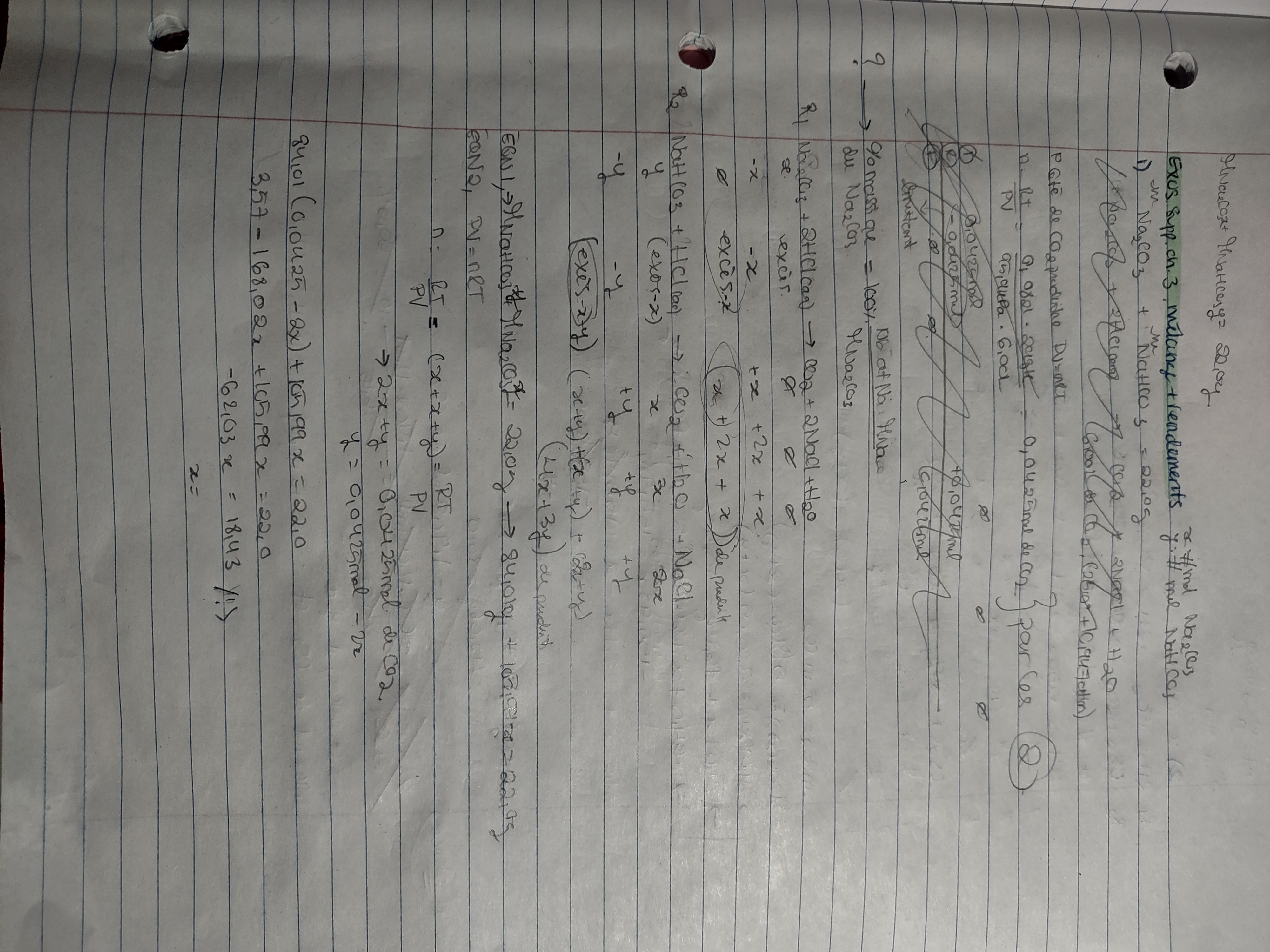 Ici je ne sais pas ce qui ne fonctionne pas dans ma démarche, j'obtiens toujours un nbre de mole negatif pour le NaHCO3 ?La réponse est 55,0% Merci bcp et c'est énormément apprécié que vous offrez de l'aide pour le postesecondaire ! 🐱
