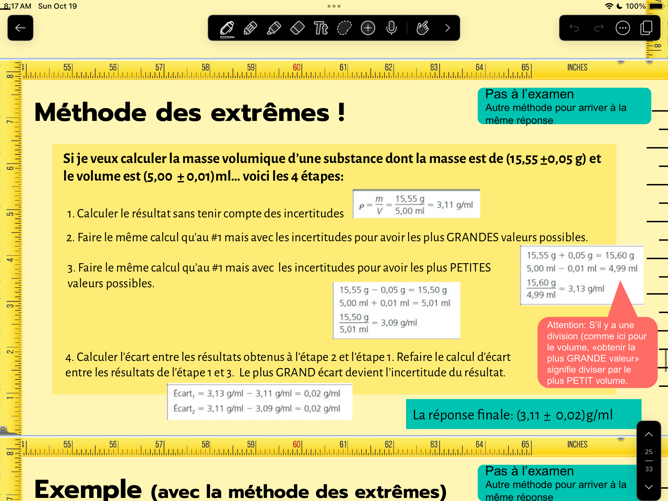 Secondaire 5 • 1mJe ne comprends pas comment faire la méthode des extrêmes pour les incertitudes dans une situation où je fais un produit croisé .Ma prof m’a montré de cette façon.
