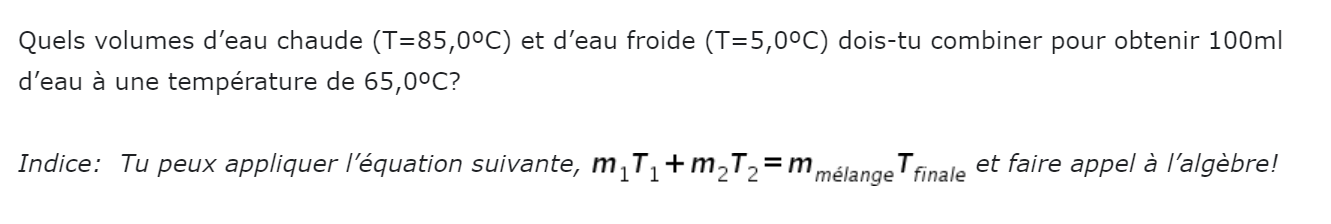 Secondaire 5 • 1acomment trouve-t-on la capacité thermique massique dans la formule Q=mcdeltaT, si nous avions tout comme information sauf le Q?
