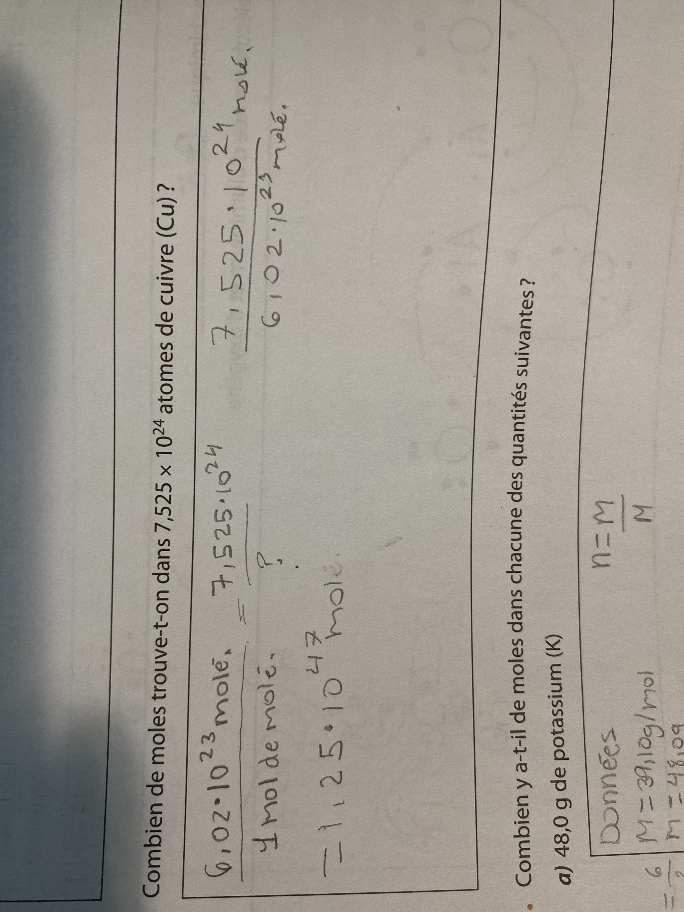 Secondaire 5 • 1aBonjour je comprend pas pourquoi je ne trouve pas la même réponse.La réponse est 12,50 mol j’ai trouvé 1,25x10^47 mol