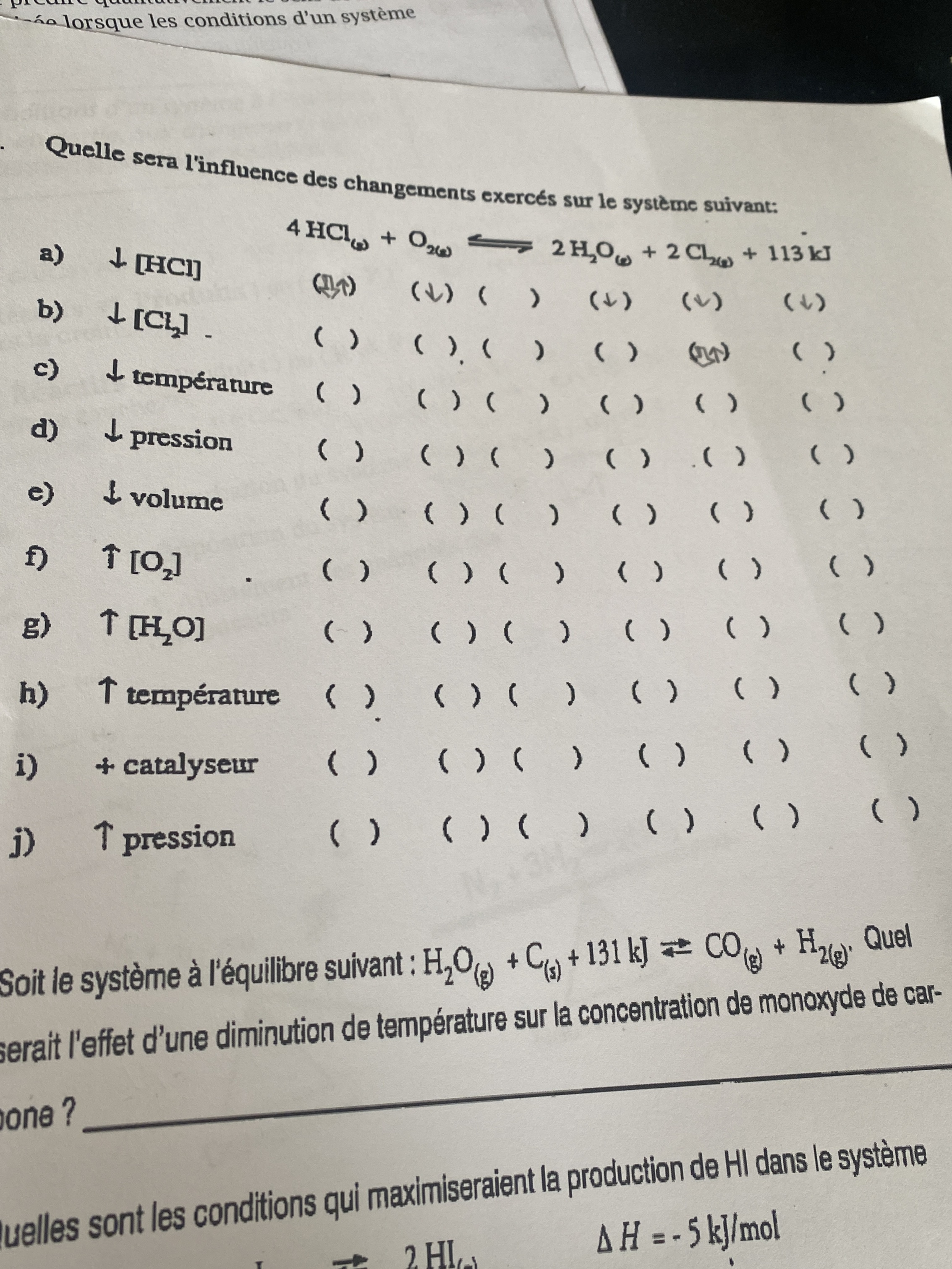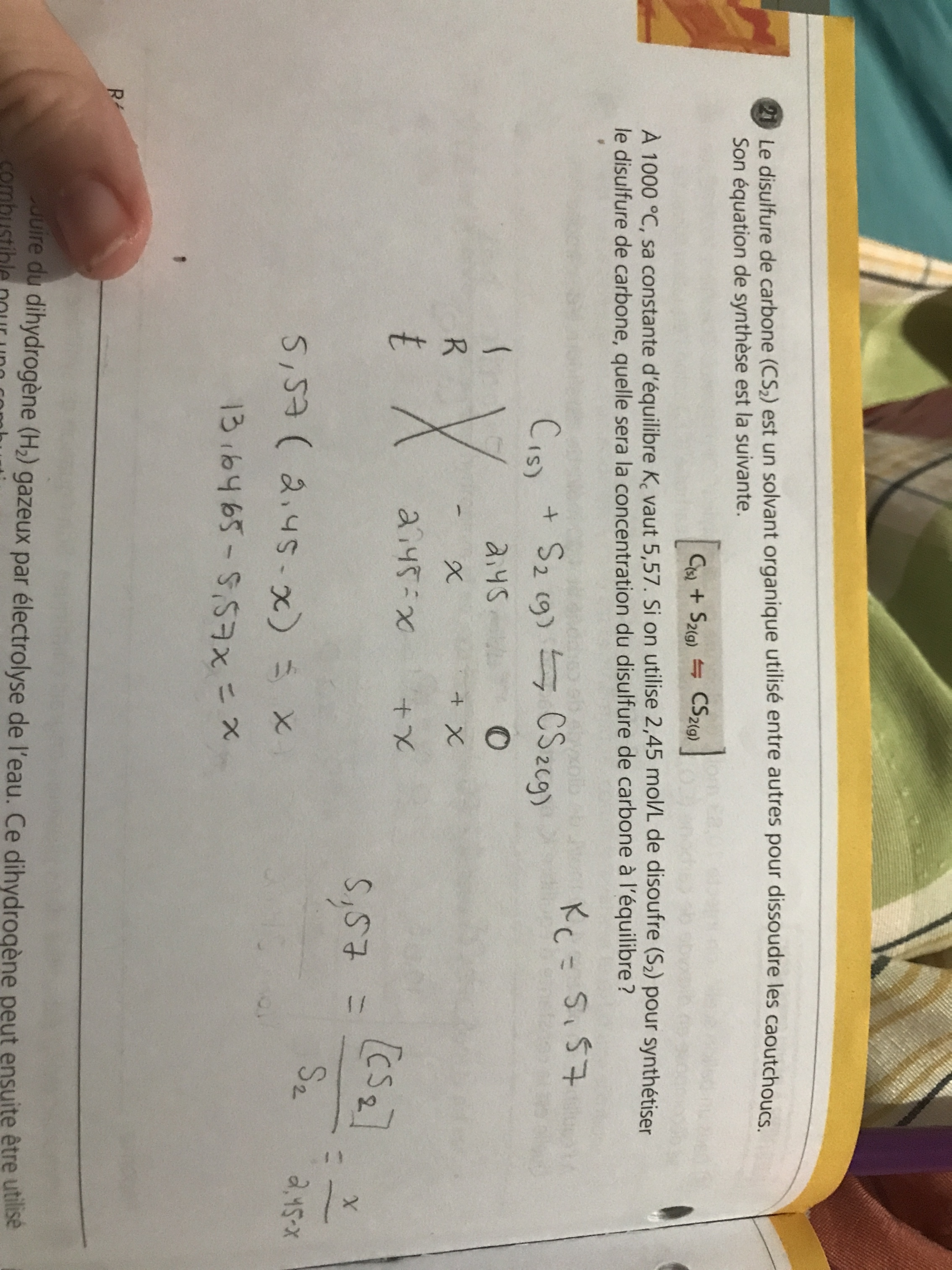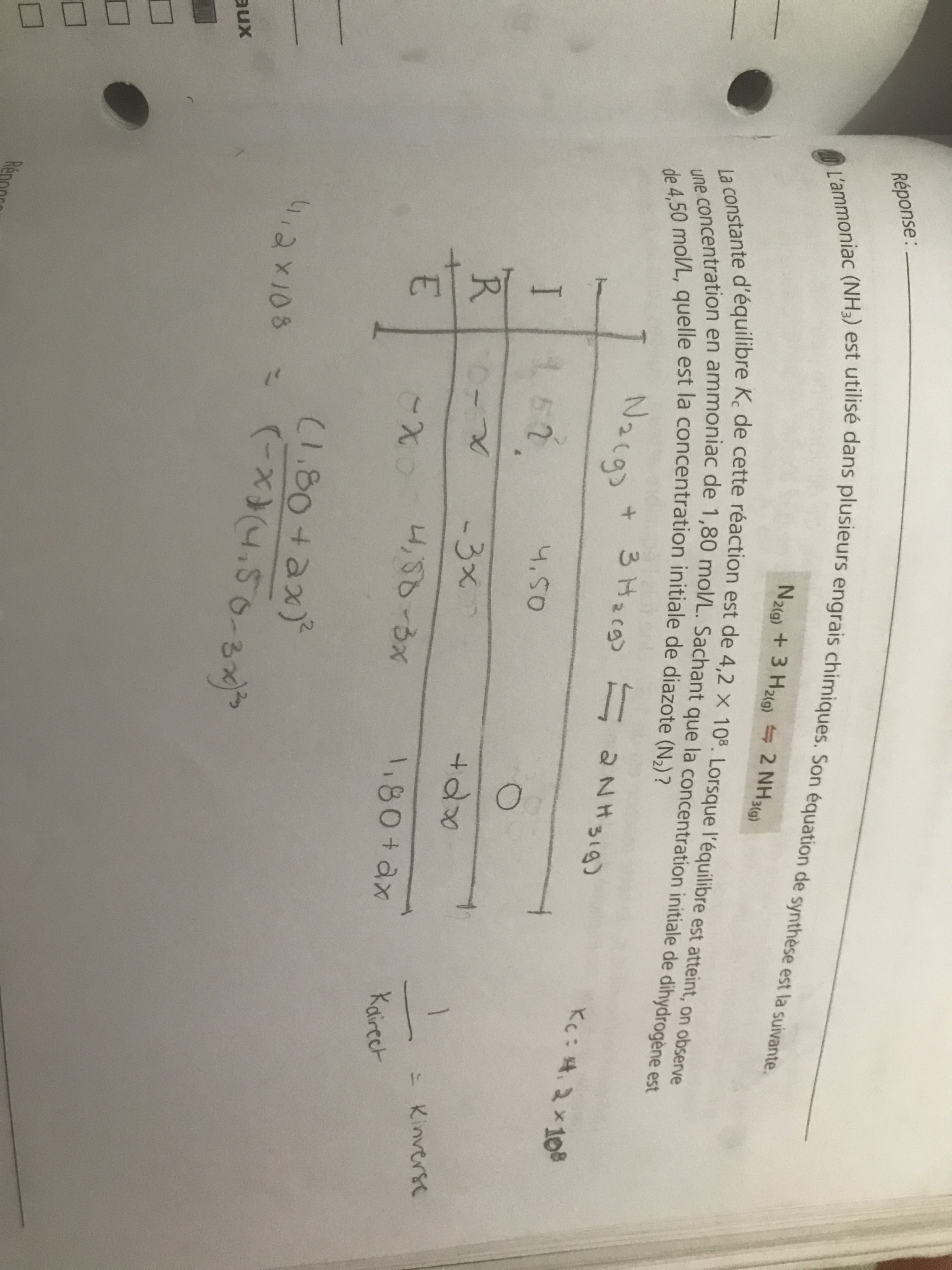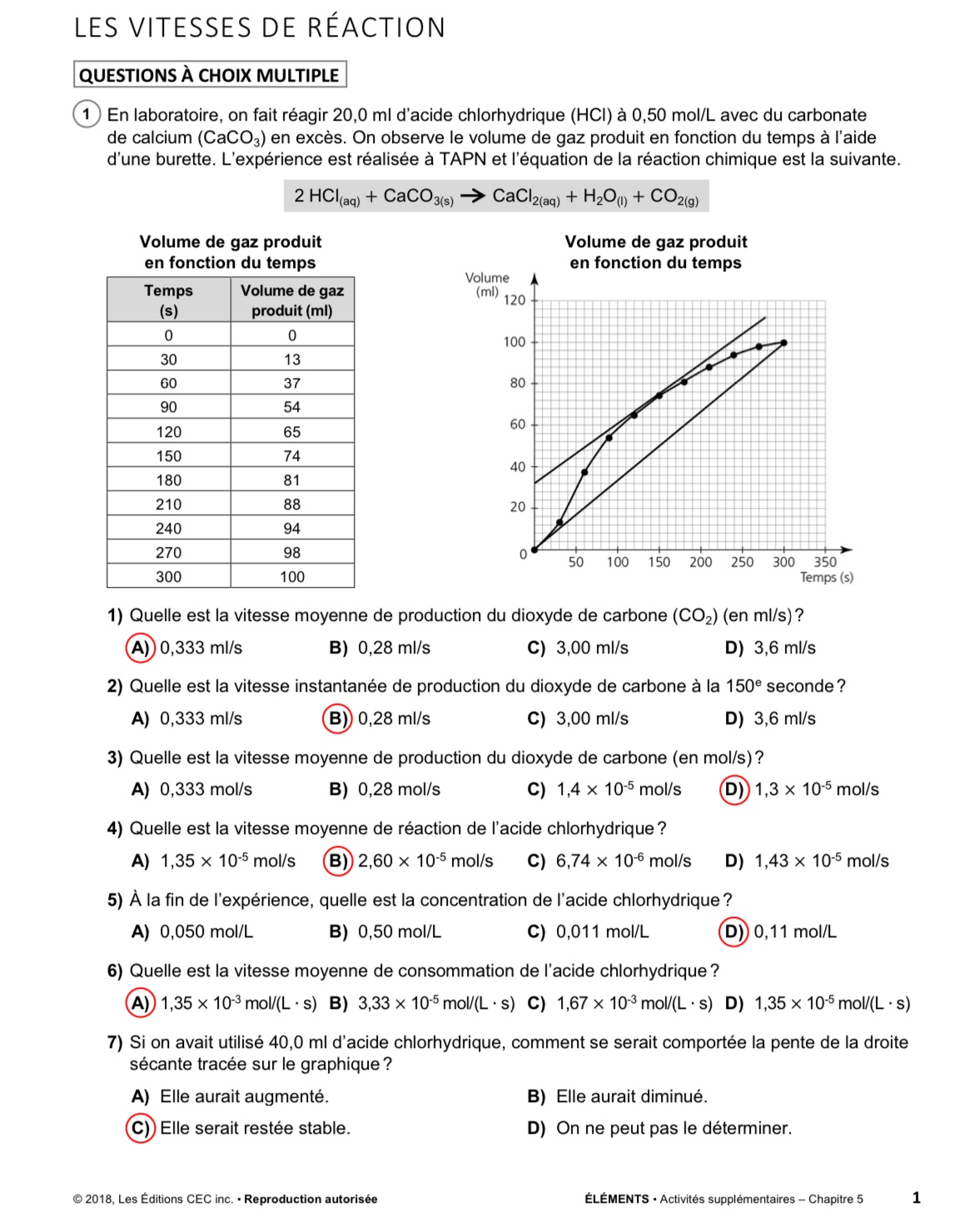 Secondaire 5 • 1aBonjour, je me demandais, au numero 5, on demande la concentration finale de l’acide chlorhydrique qui est au départ à 0,50 mol/L pour un volume de 20ml comment pouvons nous arriver à 0,11mol/L? Je connais sa vitesse moyenne qui est de 2,60x10^-5 mol/s. Je ne sais pas quoi faire quand on me demande la concentration FINALE?