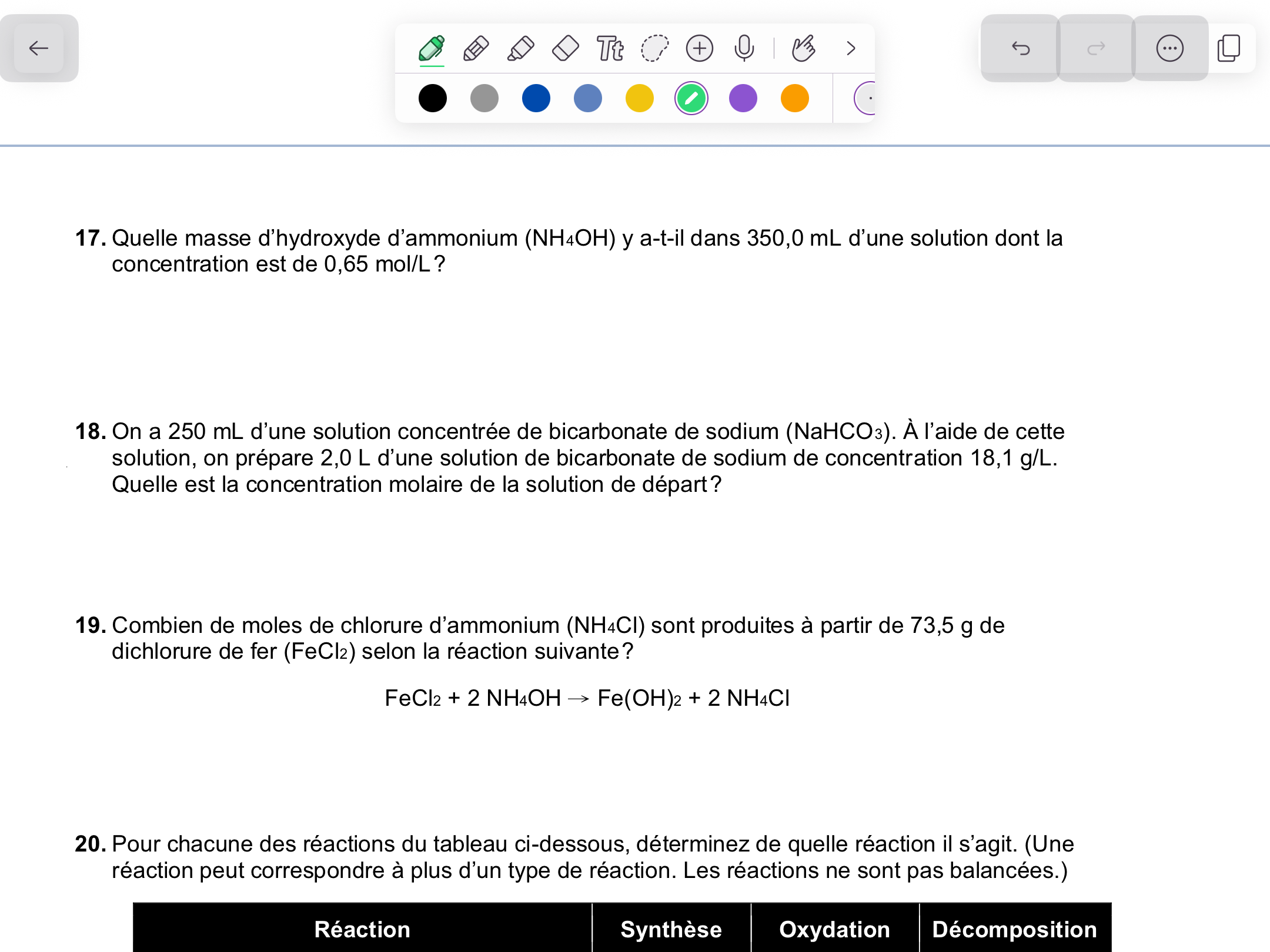 Secondaire 5 • 2mBonjour, ma stœchiométrie est un peu «rusty» et je ne comprend pas comment faire ces problèmes. Est-ce que quelqu’un pourrait résoudre un de ces exercices et me l’expliquer s’il vous plaît