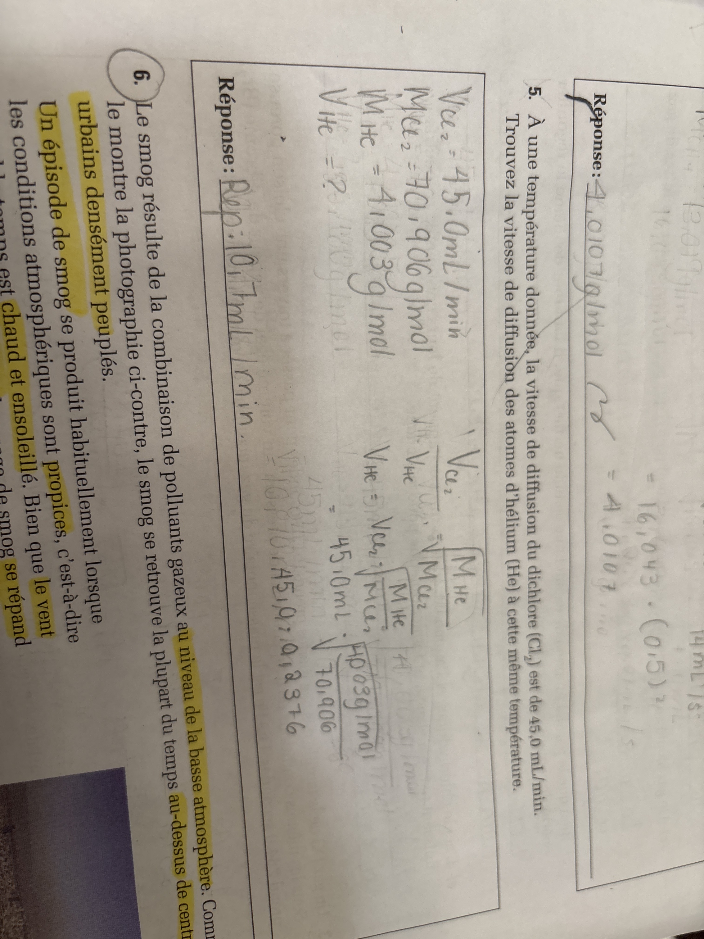 Secondaire 5 • 2mje suis confuse car dans mon corriger la réponse dit que c’est 10,7mL, mais pourtant je pensais que les gaz ayant une masse molaire plus petite se diffusait plus rapidement donc pourquoi là elle est plus lente que le dichlore ?