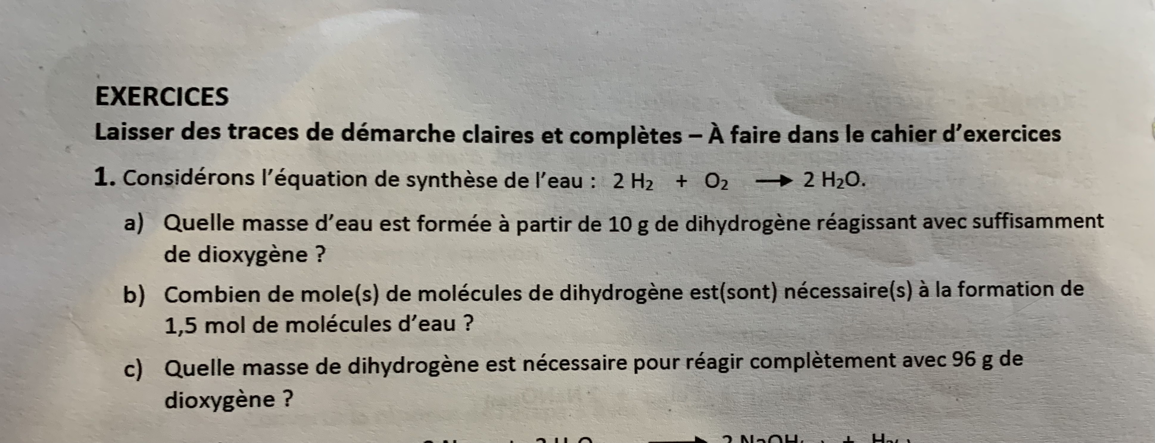 Secondaire 5 • 2mBonjour, j'ai de la misère a faire l'étape 1 a) en stœchiométries. J'ai commencé par balancer mon équation, mais par la suite suis-je censé trouver la masse de O2 ou 2H2O? Je suis tout mêler par quelle étape commencer ?
