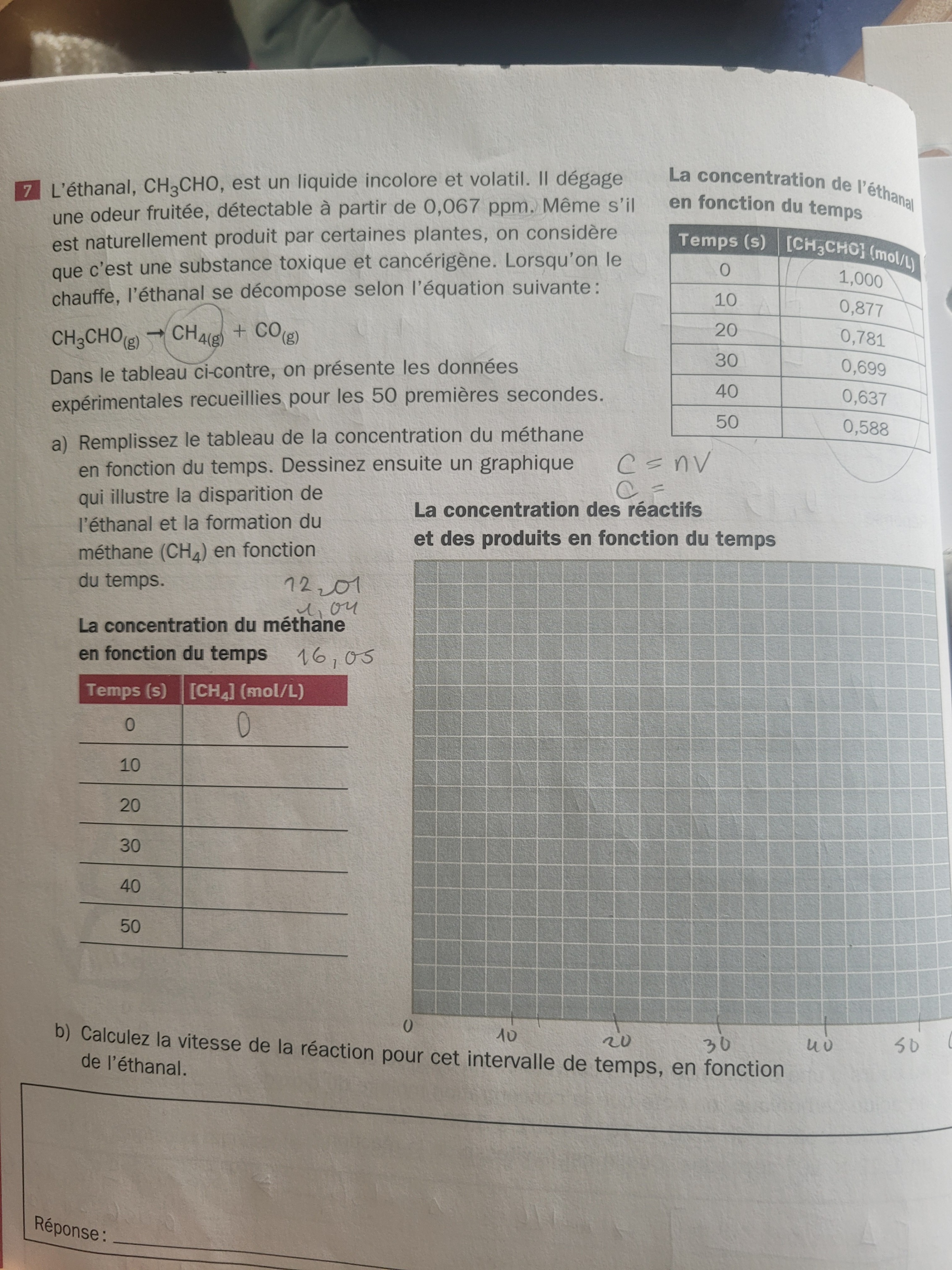 Secondaire 5 • 1aBonjour, comment trouver le nombre de mol pour être capable de trouver le concentration en faisant c=n/v lorsque nous avons seulement la vitesse de réaction en litre par seconde ? Merci !