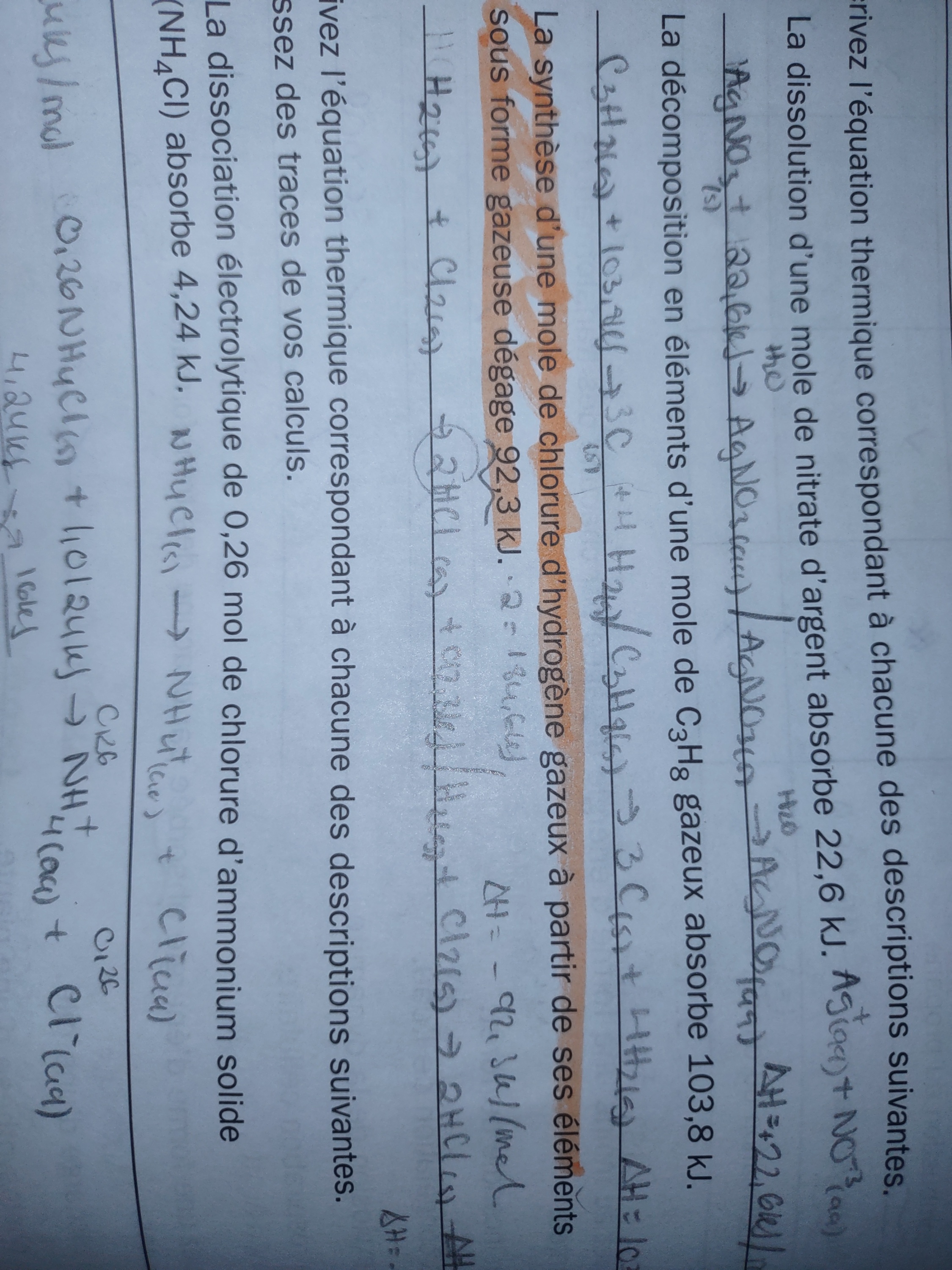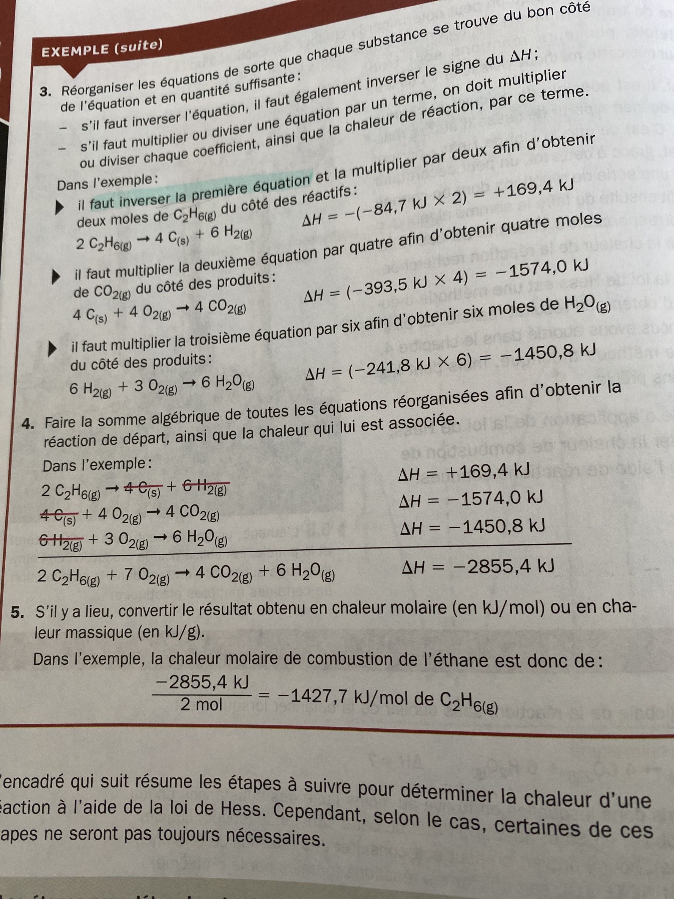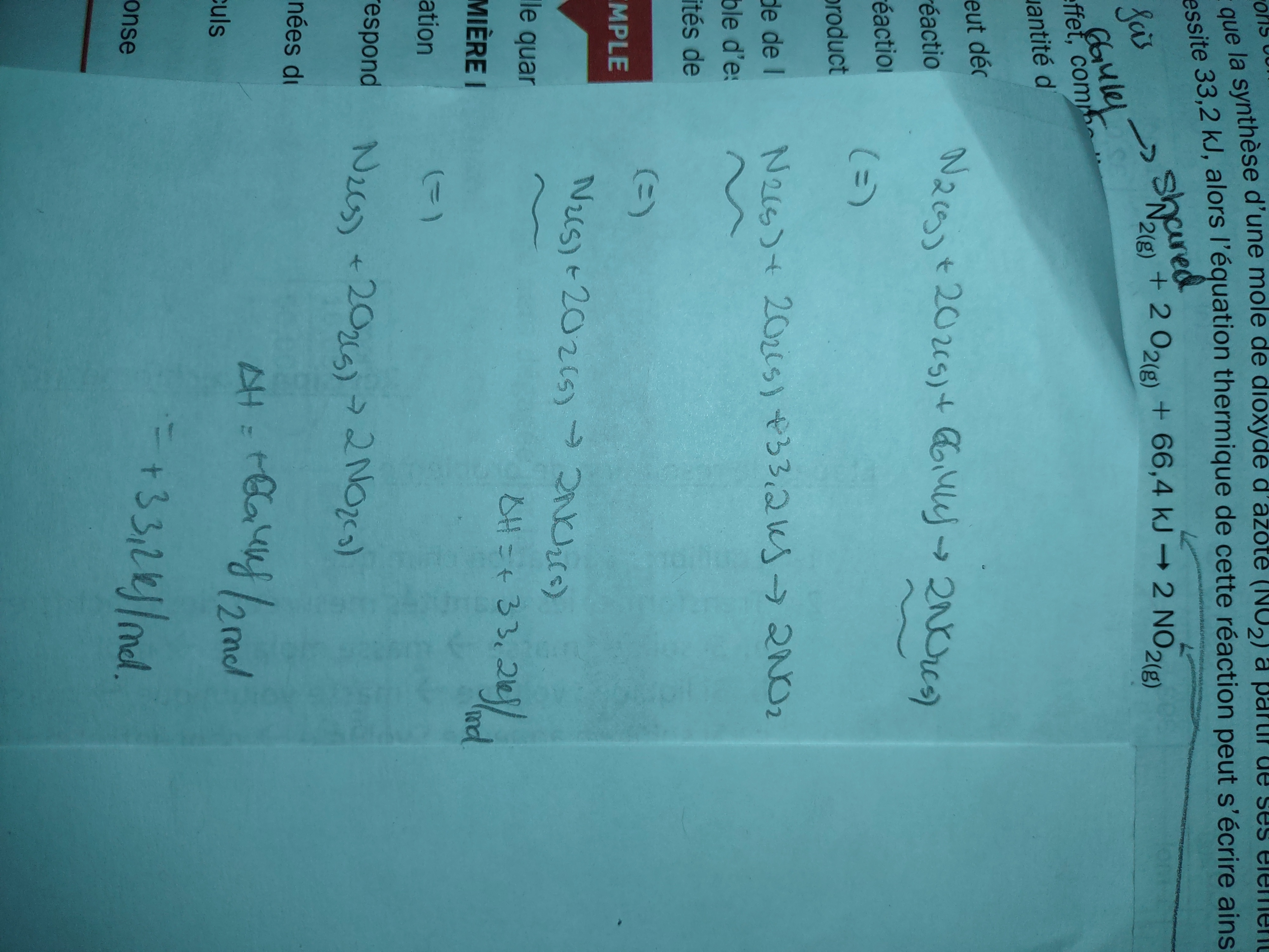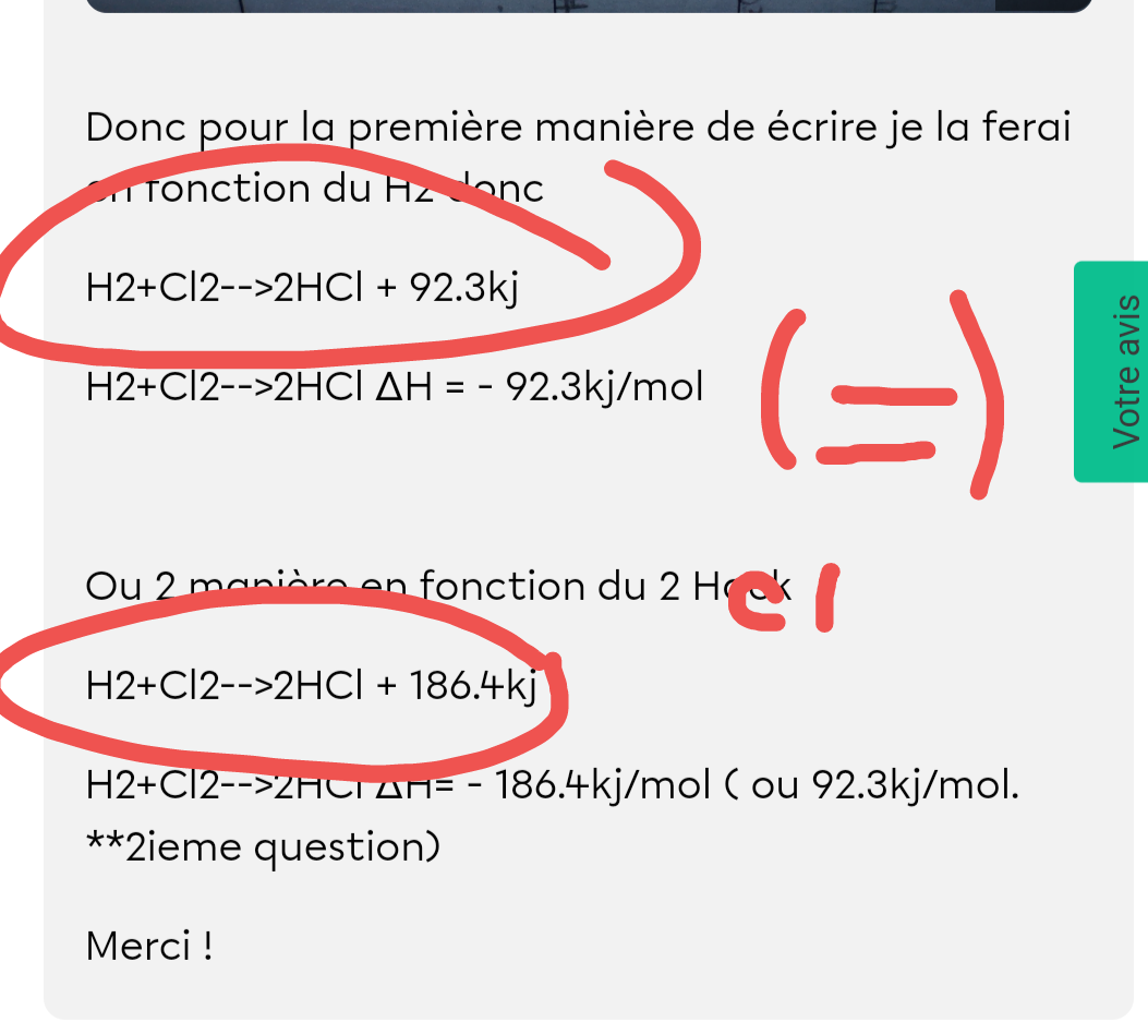 La peut être erreur iciEnsuite j AI la même question pour cette équation : est ce que c' est bon de écrire comme ça , genre mes kj/mol ils sont bien égaux aux proportions dans la réaction?Donc ici pour savoir en fonction de quoi j AI mis ma chaleur molaire c' est souligné en vagues.
