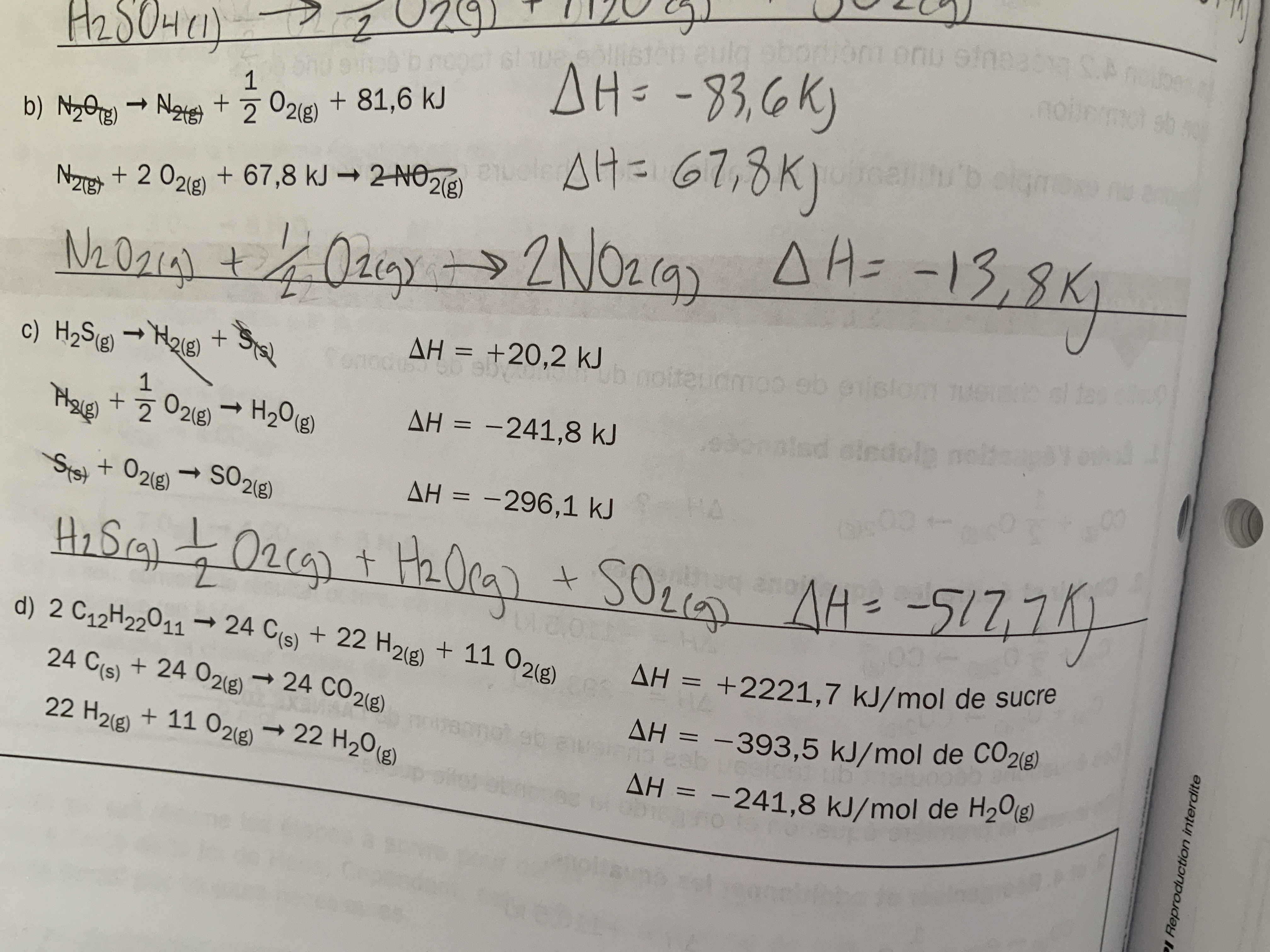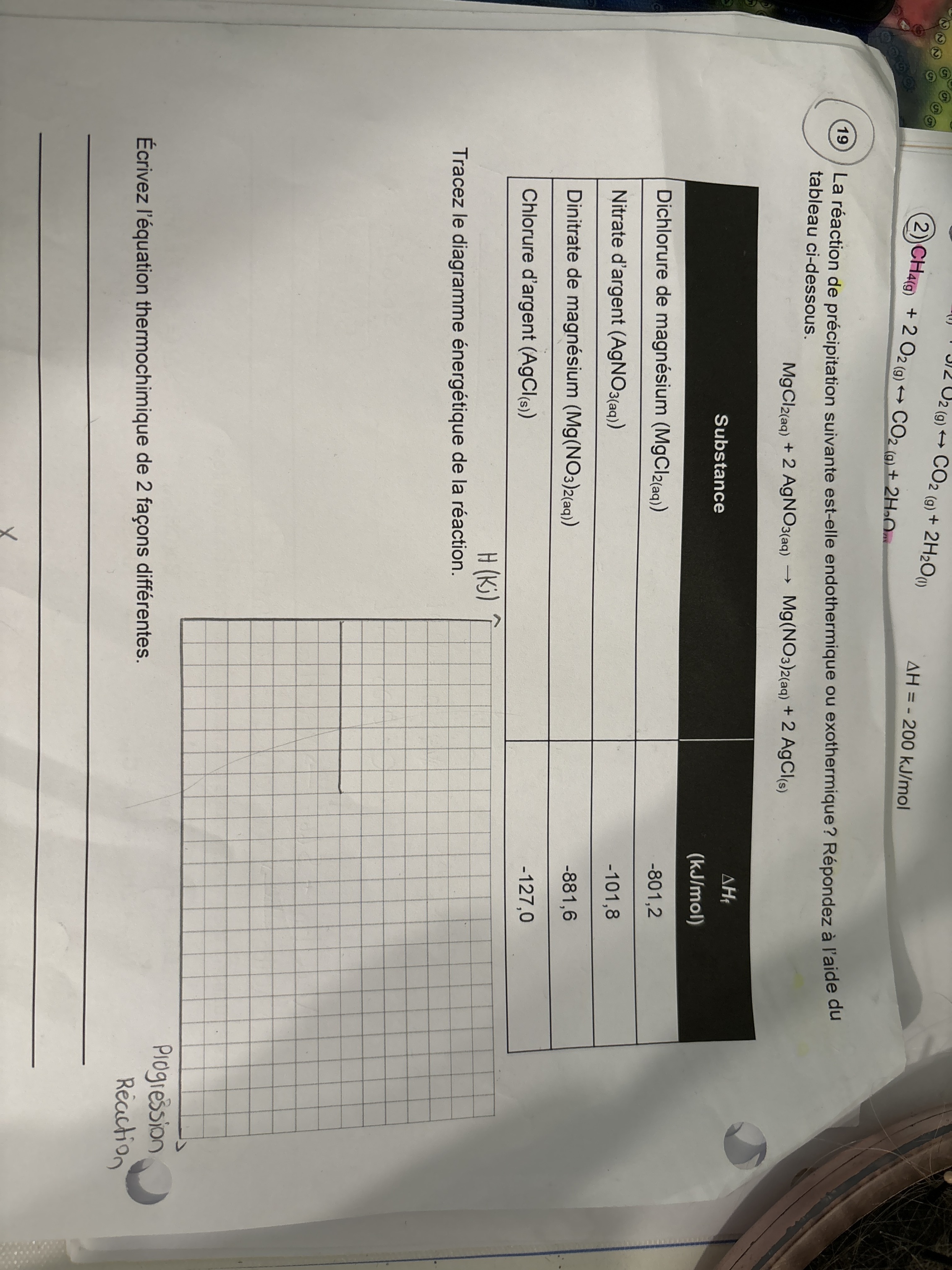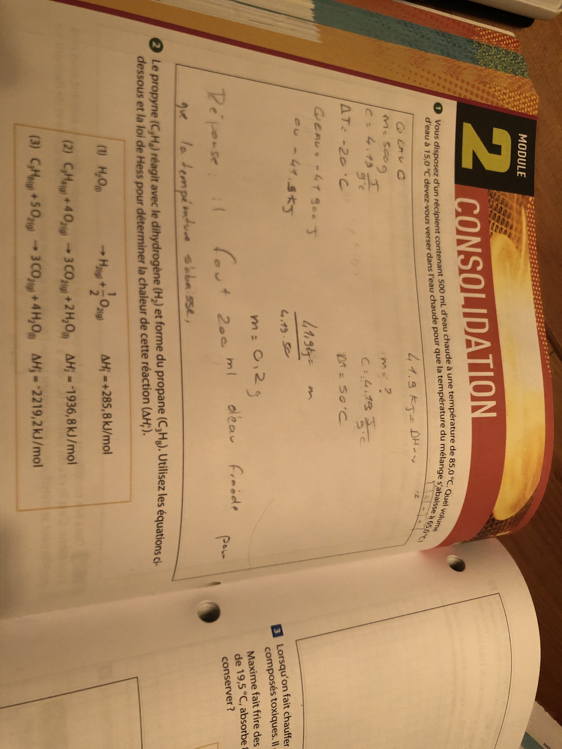 La peut être erreur iciEnsuite j AI la même question pour cette équation : est ce que c' est bon de écrire comme ça , genre mes kj/mol ils sont bien égaux aux proportions dans la réaction?Donc ici pour savoir en fonction de quoi j AI mis ma chaleur molaire c' est souligné en vagues.