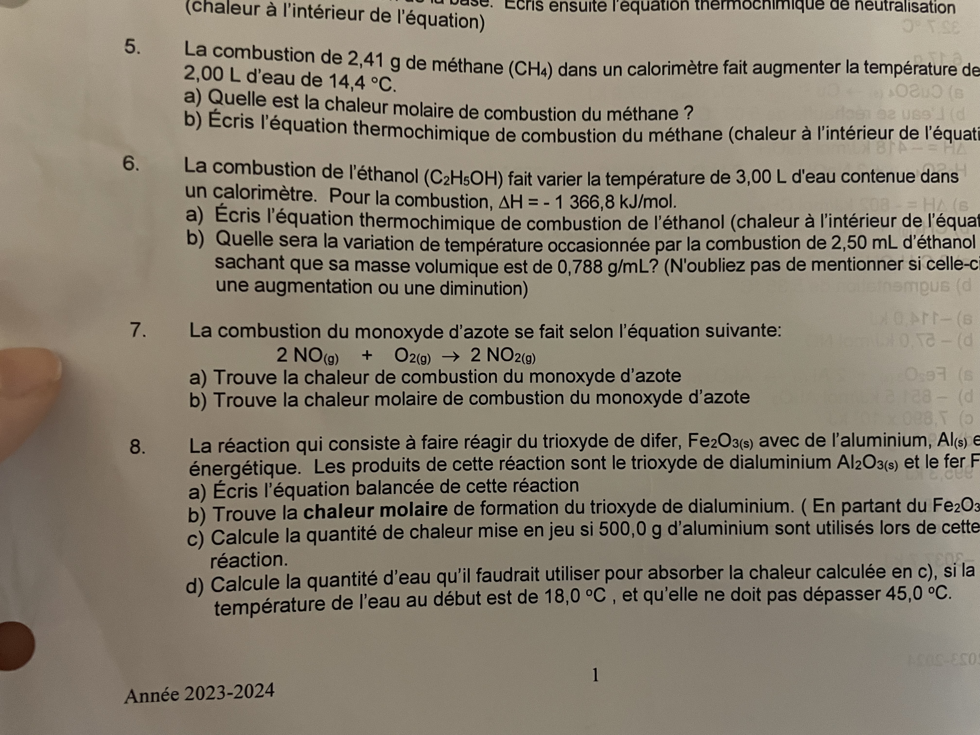 Je suis entrain de faire des exercices sur la loi de Hess. Je dois déterminer l’équation thermique avec des mécanisme de réaction. Deux numéro de suite je suis arrivé à la bonne réponse sauf pour le O2. J’ai écrit 1/2 mais je suis censé arriver à 3/2. Je ne comprend pas comment je suis supposé arriver à cette réponse. Merci