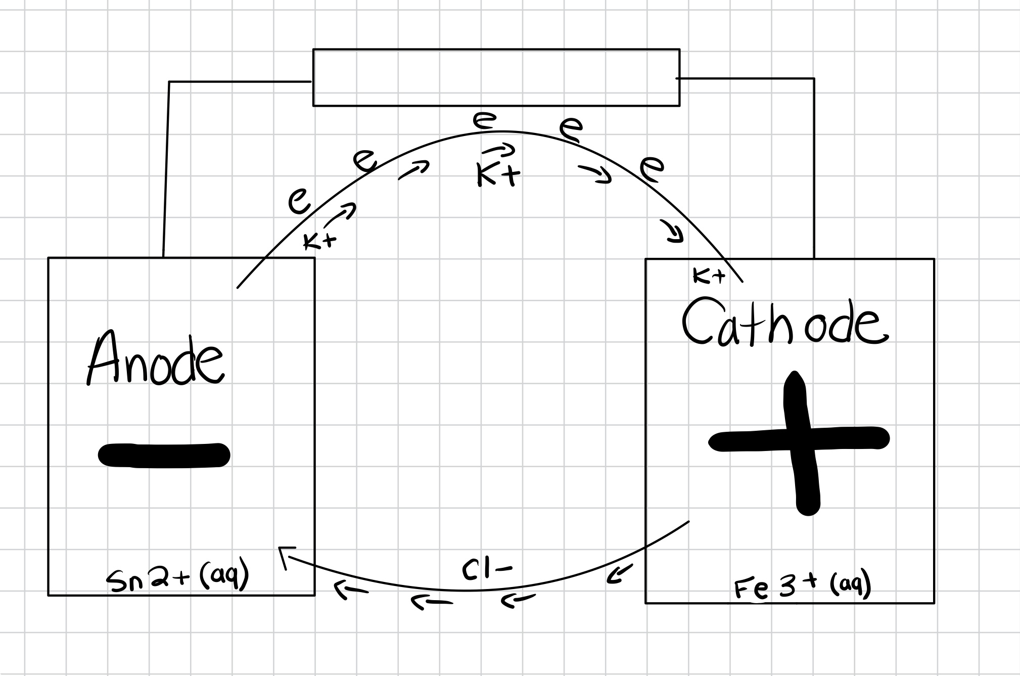 Faire un schéma de la pile sur lequel le sens de circulation des électrons est précisé ainsi que le sens de migration des ions K+/Cl- dans la jonction électrolytique