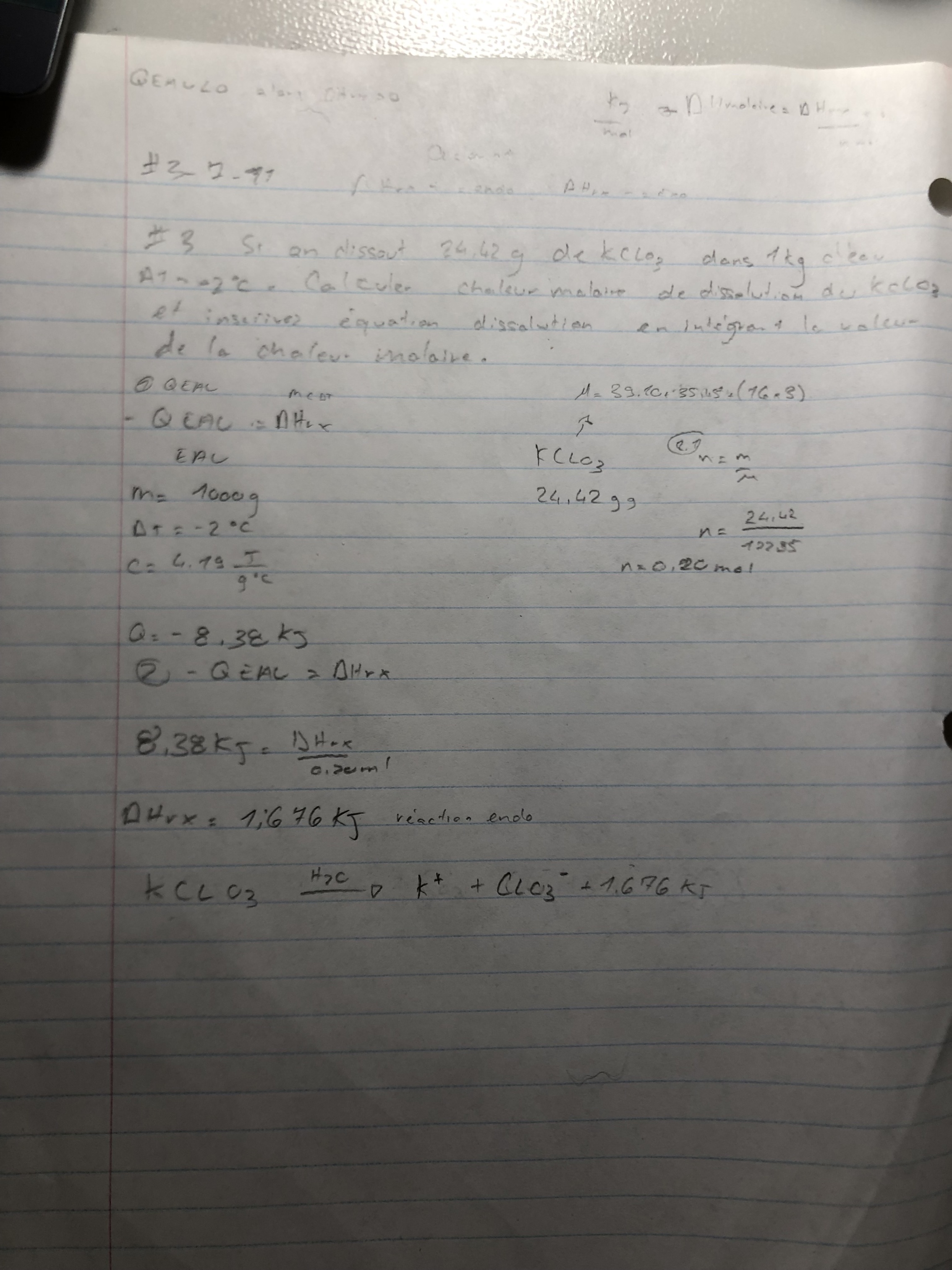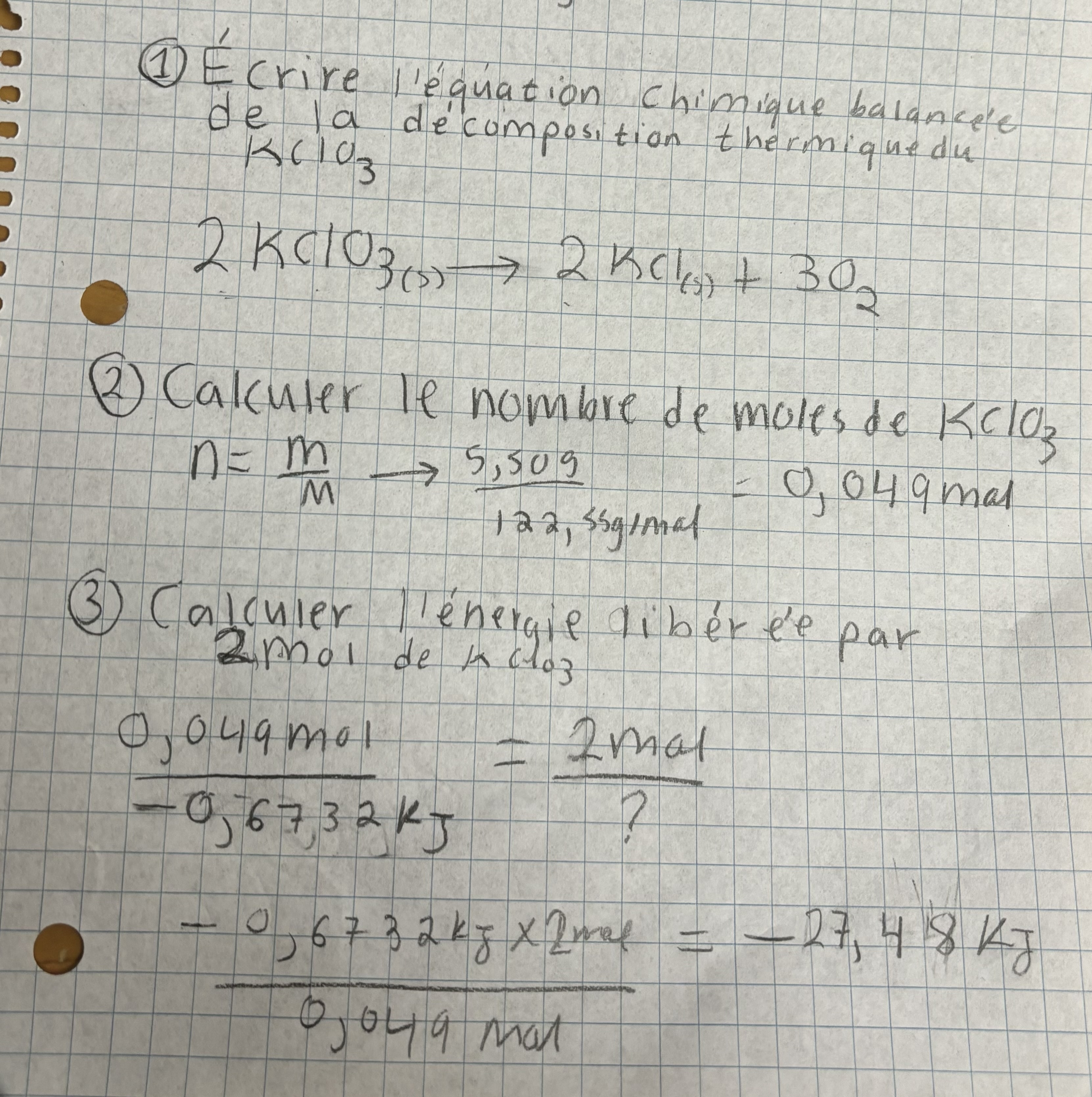 La décomposition thermique de 5,50 g de chlorate de potassium (KCIO,) dégage 673,2 ] d'énergie.
