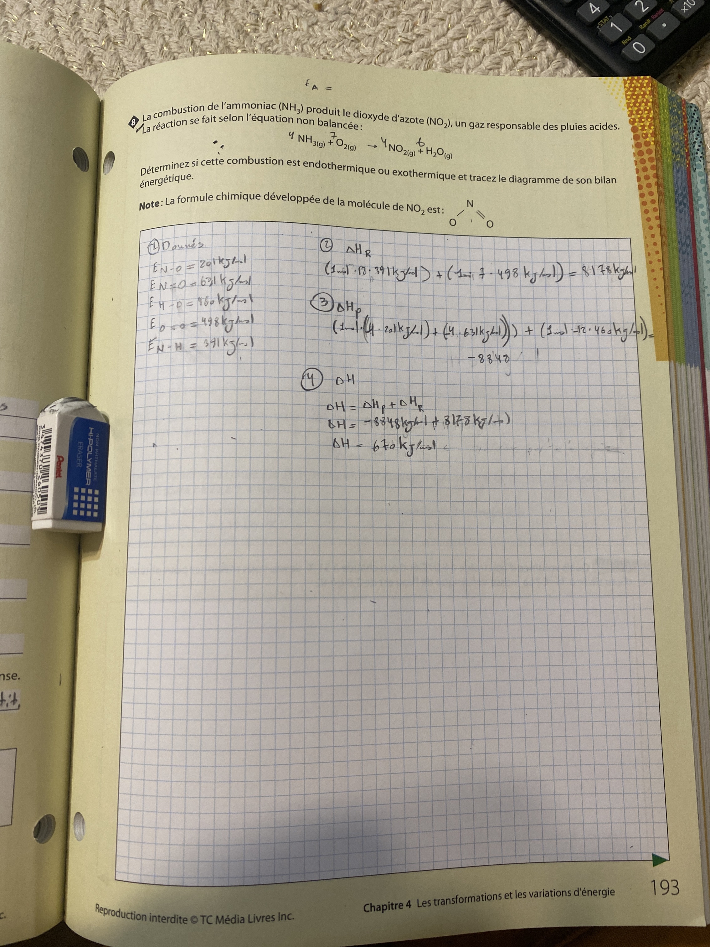 Secondaire 5 • 1aQuel est la bonne résolution de ce problème de bilan énergétique en chimie sec 5. La bonne réponse doit être delta H= 1.29 x10^3 kj/mol